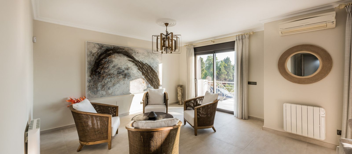 This gorgeous villa was fully renovated in 2018 to the highest of standards, with luxurious and high quality finishes, and boasts stunning panoramic views of the Mediterranean sea and La Concha mountain. The spectacular heated salt water infinity swimming pool of 12m x 5m also has an integrated Jacuzzi. The garden is easy to maintain and the outdoor kitchen/bar area is a great place to entertain family and friends.