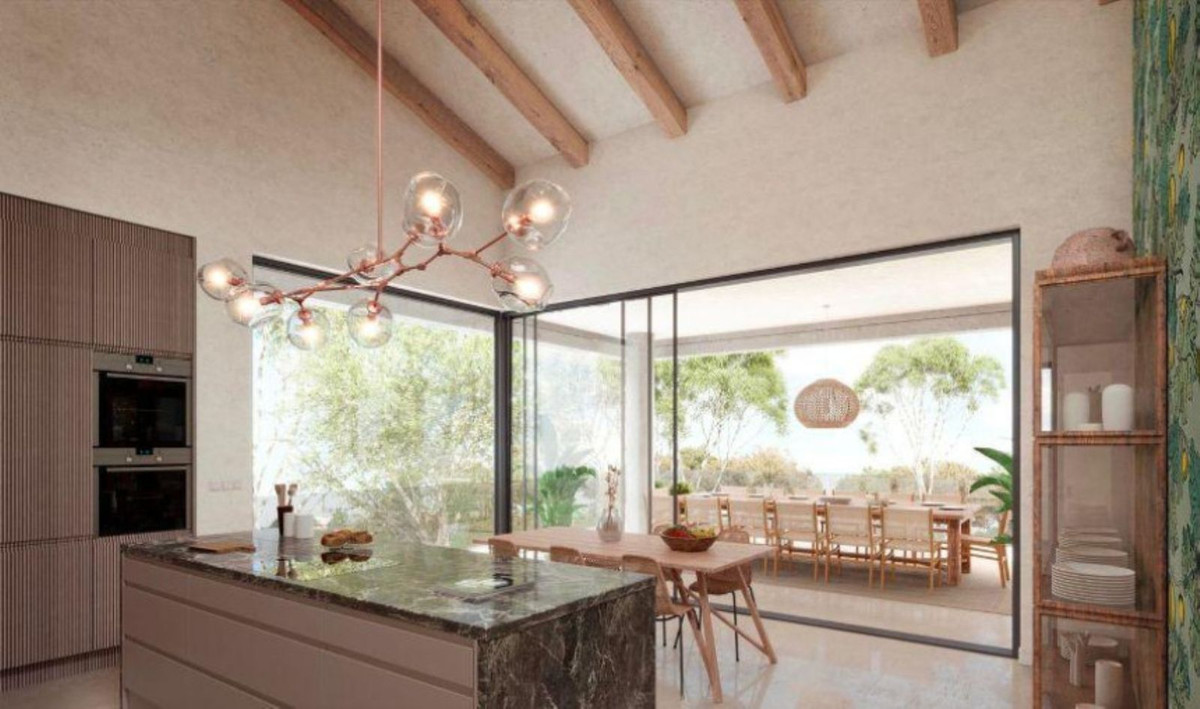 On the ground floor, a large living room has been designed, separated from the dining room by a column-fireplace for colder days. The kitchen will be very functional and will be open to the terrace and pool through a porch where you can set up a large dining table to take advantage of the good weather most of the year.