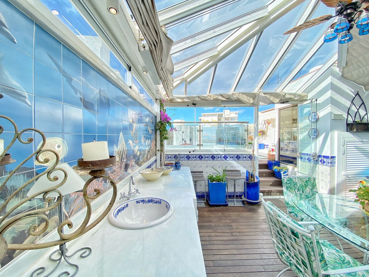 A fantastic terrace is covered by a dome with a glass roof, allowing for year-round use.