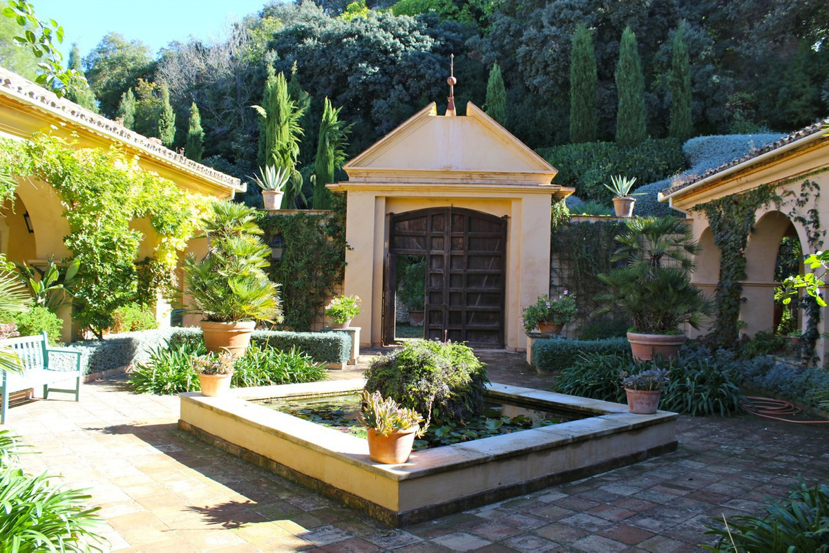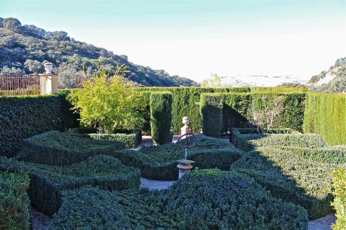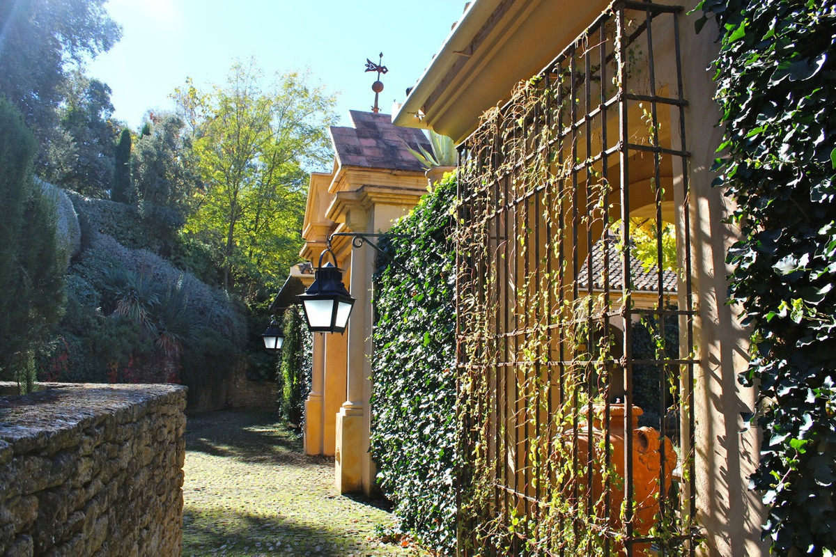 One of the most imposing and spectacular houses in Spain, it is set in a totally private valley surrounded by hillsides and rich forest on a rural property of 260,000m2. This palatial style property is located 14 kilometres north of Ronda, Hemingway's favourite town in Spain, with its famous bridge and bullring, the oldest in the country. The villa is designed and built to the exacting specifications of its owners 10 years ago, and is a reflection of their good taste. Almost 800m2 built. You enter through a typical Andalusian courtyard with large vegetation and a sense of serenity, a fish pond in the centre and different living areas. A hallway runs the length of the central wing of the house, at the end of the hallway is the fully fitted kitchen with top quality appliances, stainless steel cupboards and marble surfaces with direct access to the front patio and gardens with barbecue area, laundry room and utility room. On the opposite side is the dining room of enormous elegance with an 18th century mahogany dining table with French windows overlooking the well maintained lawn and surrounded by a pretty flower bed, a beautiful pergola and barbecue area for alfresco dining. The next room along the hallway is the "little" sitting room, a very relaxing room, with double doors opening onto the outside terrace. The spacious main living room with marble floors comes next with a huge fireplace and a hand-woven Indian carpet which was specially commissioned in Jaipur and took eight months to make. Next is a study or office, at the other end of the hallway is the very elegant and beautifully furnished master suite, with its own sitting room and wonderful views from the French windows that face two sides of the room. Impressive as it is, even more so is its enormous bathroom with bathtub, white marble washbasin and shower. The other four bedrooms are located in this wing of the house, one of them accessed from the hallway, the other three from the front courtyard. All are individually decorated and furnished, but all share the same impeccable quality and size as the other rooms in the house. All have large and attractive en-suite bathrooms. Majestic staircases descend to the terrace immediately below which has been laid out as another area of the formal garden, where fish ponds and tranquil sitting areas are enjoyed. A large part of the hillside of the estate has been cultivated with 1 hectare of vineyards producing really good quality "Reserva" grapes and over two hectares of olive trees. On one of the hillsides above the house, the owners have created a small Mediterranean garden amongst the trees, just another delightful place to discover as you explore this wonderful estate.