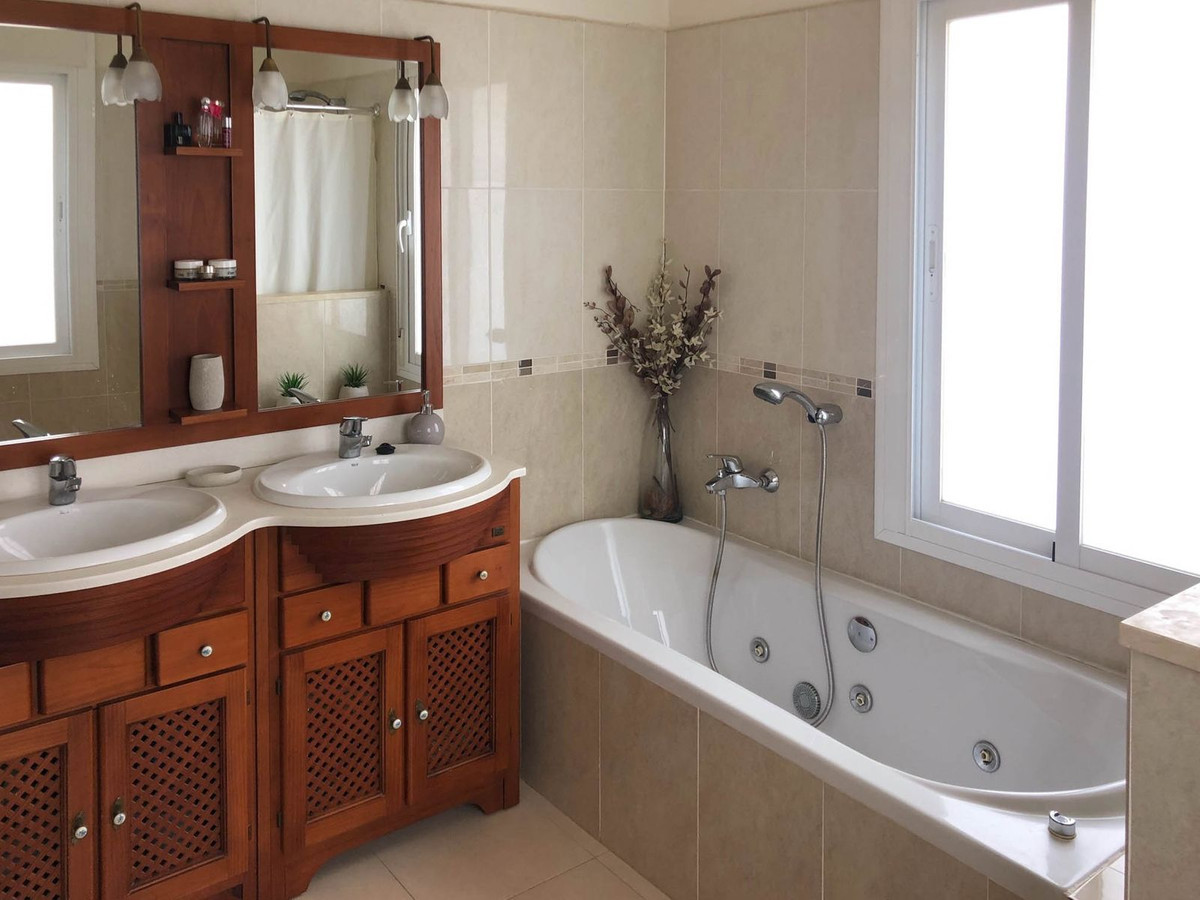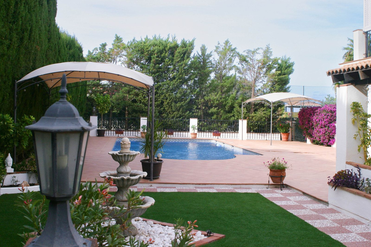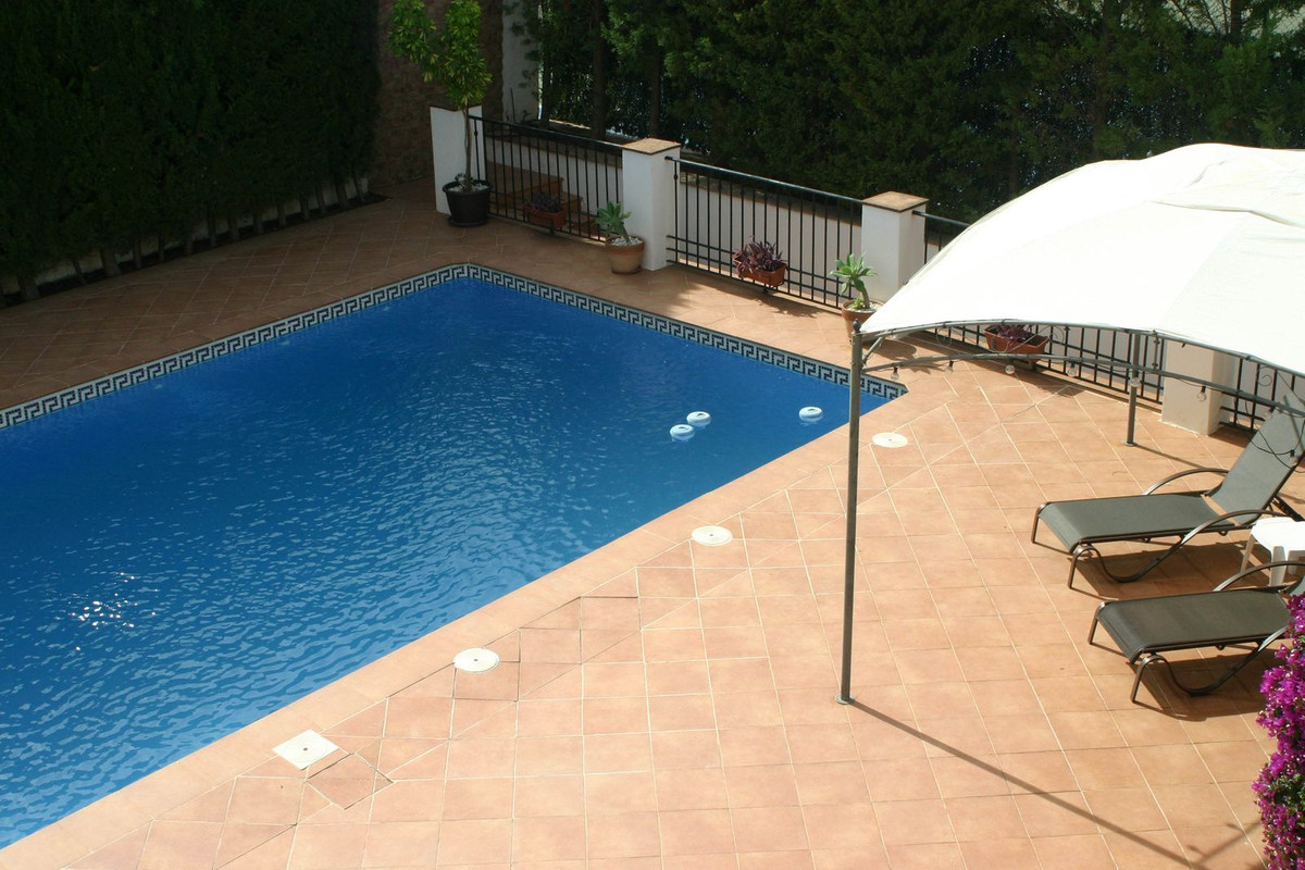 Outside, at the rear, there is a kitchen area, a large 5 x 3 meter built pergola with a tiled roof, a garden area with artificial grass, a fountain and 2 more pergolas next to the pool. The pool measures 5 meters by 9.8 meters up to the steps that take up 1.8 meters more. To the side is another terrace with planted borders, an orange tree, a lemon tree and a utility room with sink, washing machine, WC and shower. Steps take you to the lower level and driveway, where there are more planted areas, including 2 avocado trees.