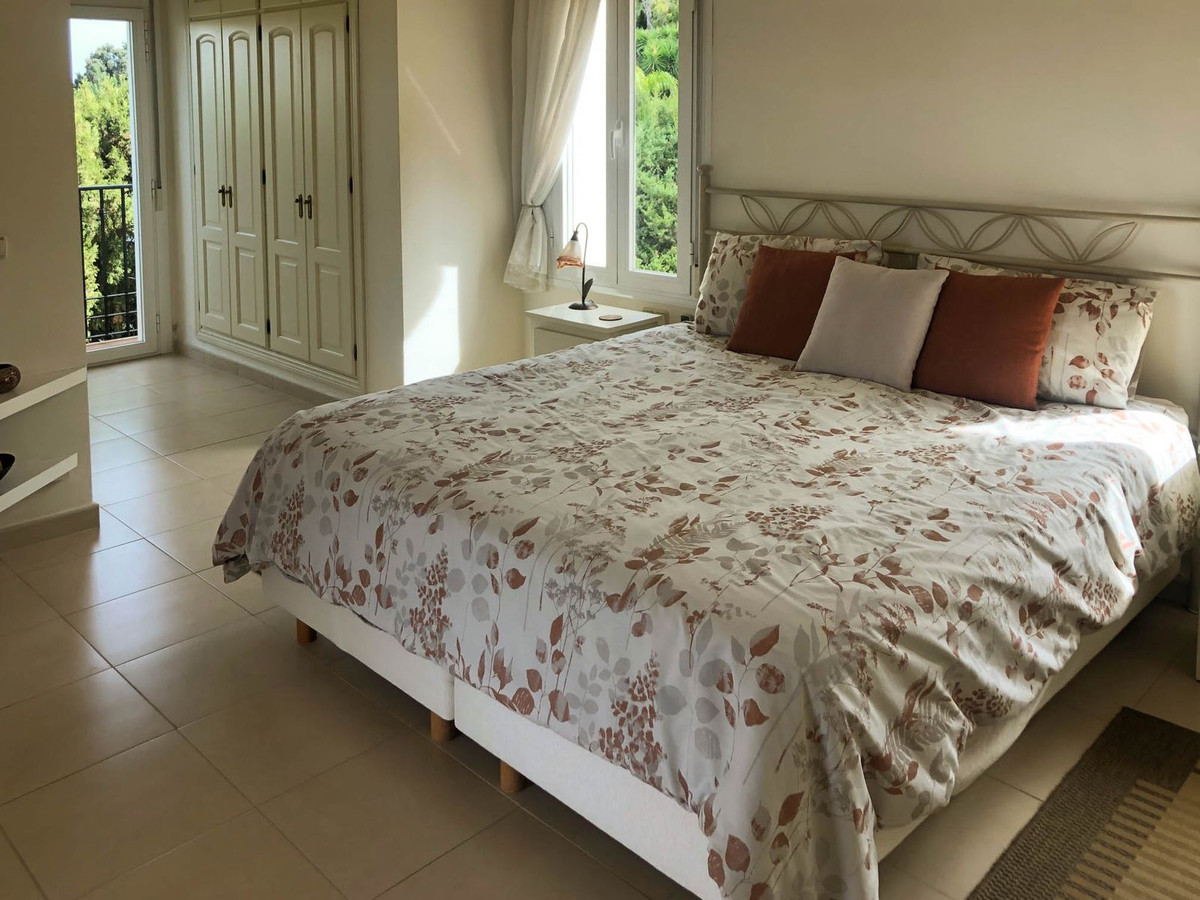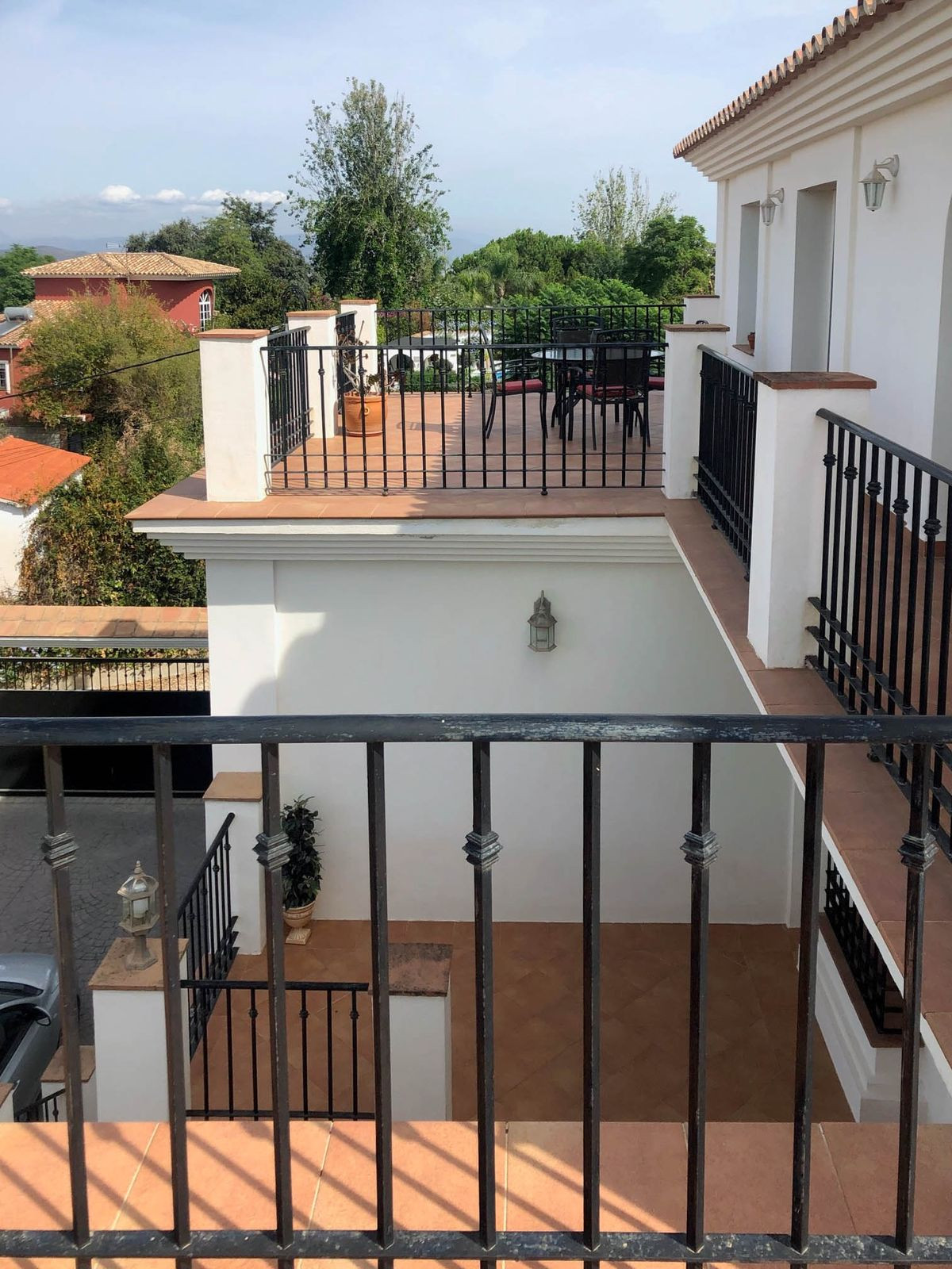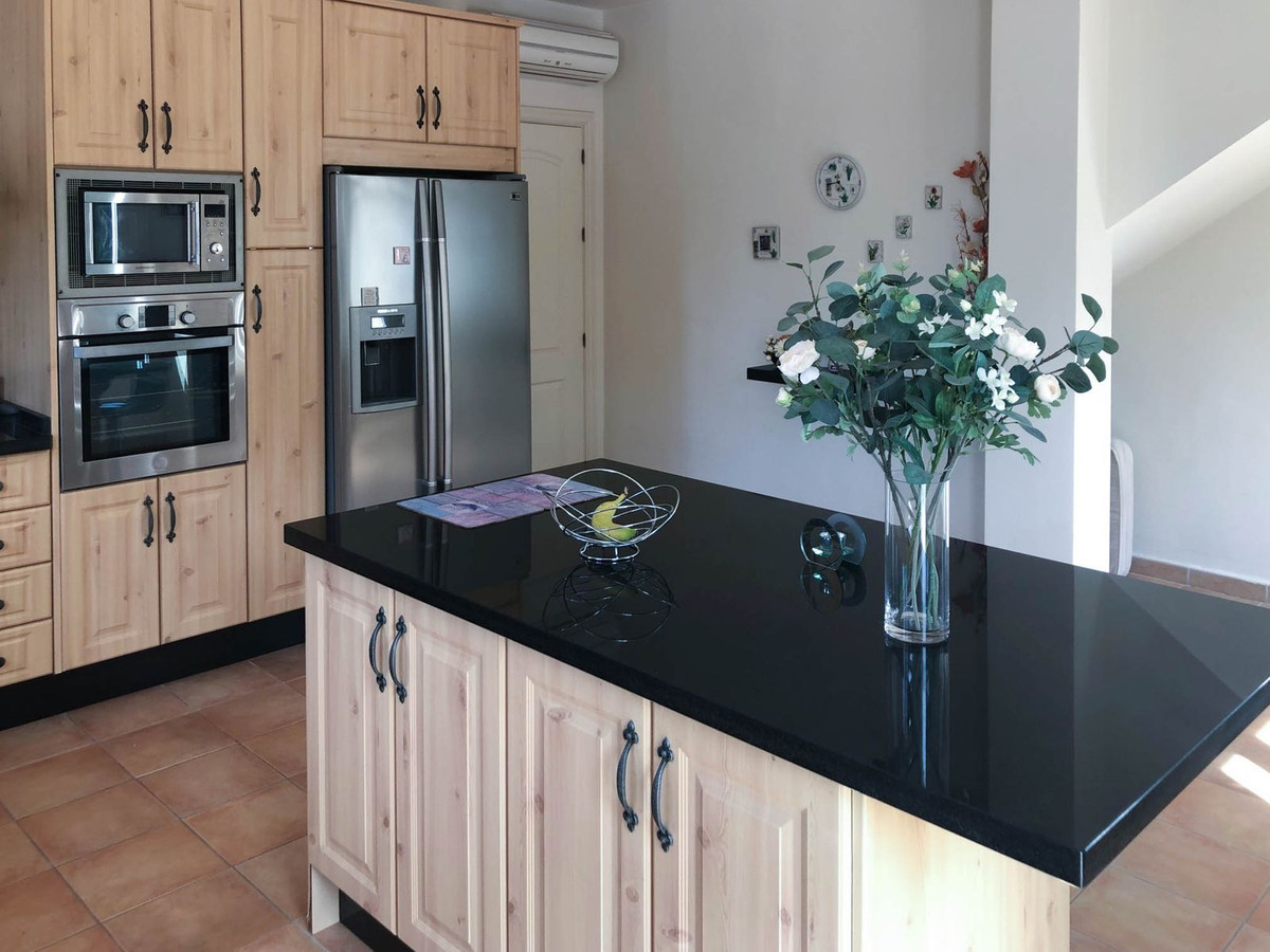 Outside, at the rear, there is a kitchen area, a large 5 x 3 meter built pergola with a tiled roof, a garden area with artificial grass, a fountain and 2 more pergolas next to the pool. The pool measures 5 meters by 9.8 meters up to the steps that take up 1.8 meters more. To the side is another terrace with planted borders, an orange tree, a lemon tree and a utility room with sink, washing machine, WC and shower. Steps take you to the lower level and driveway, where there are more planted areas, including 2 avocado trees.