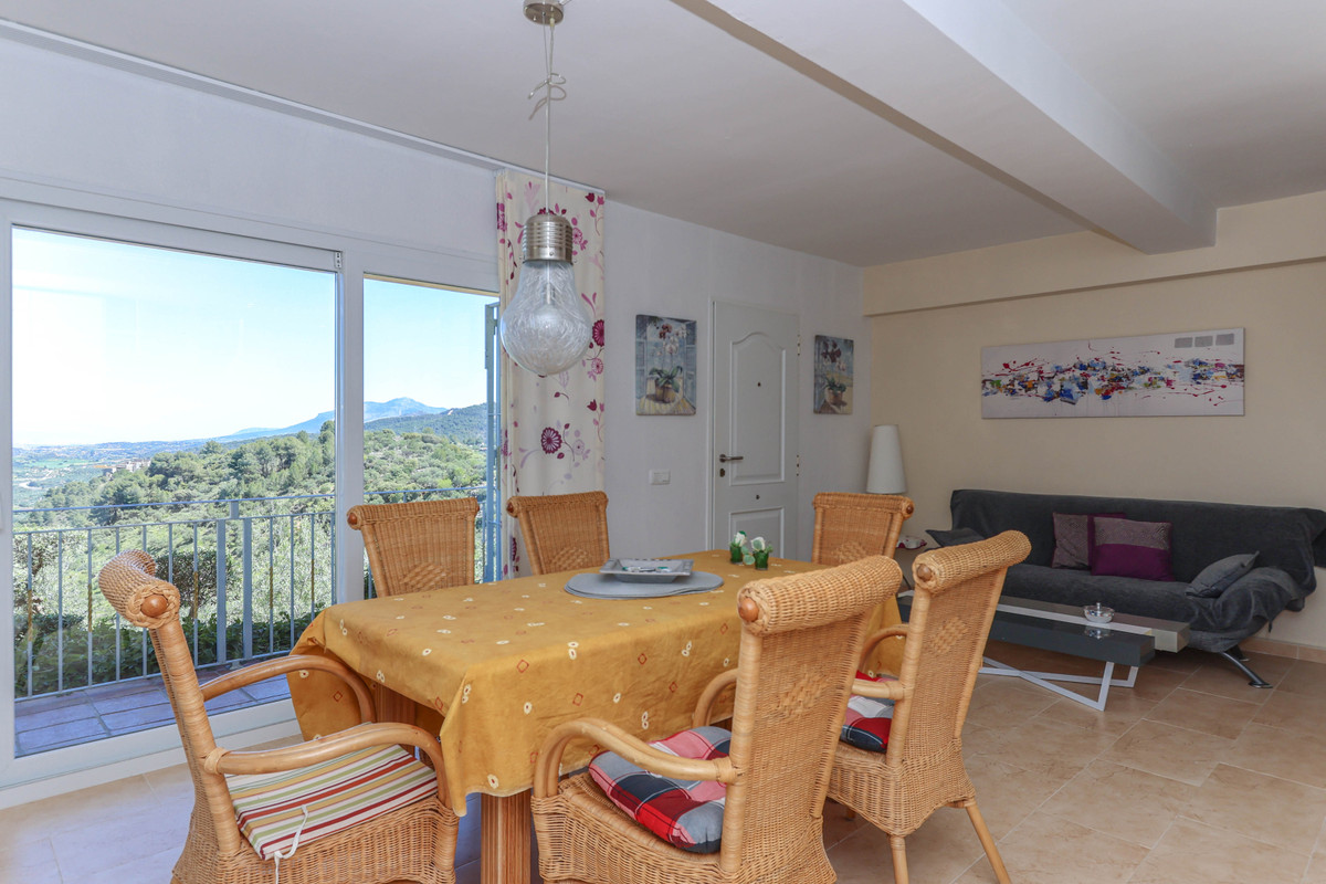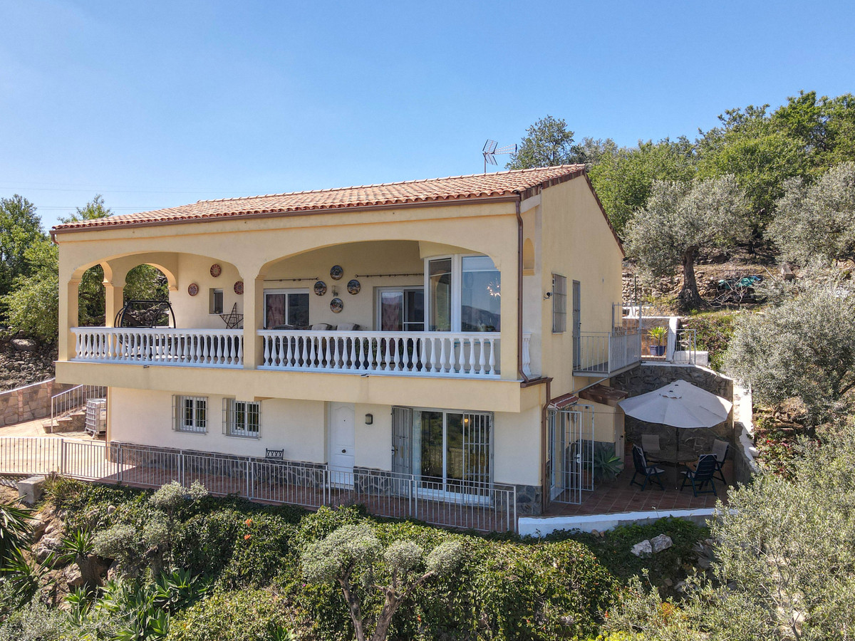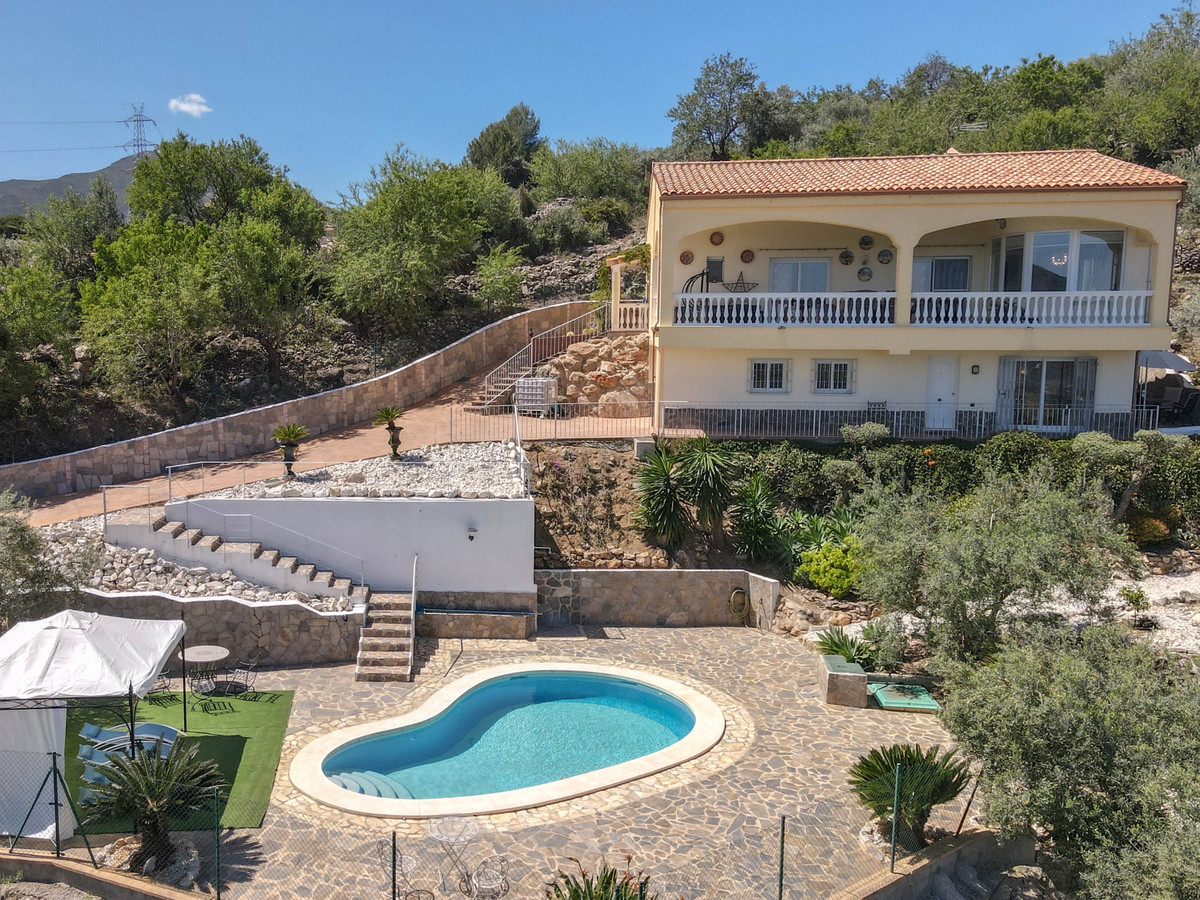 The house is built on two levels. The main accommodation is located on the the top level with the separate apartment sitting below. A staircase leads upto the front door with access to the rear shady terrace. Entering into the Villa you are immediatley impressed by the quality of the finish. To the right is the guest bathroom and to the left Bedrooms 3. Walking from the hallway into the bright lounge with high ceilings and two sets of patio doors the room feels light, airy and welcoming. A wood burning stove is located in the corner to provide winter heat. Both set of patio doors lead to the large covered terrace which sits to the front of the property, this is the most wonderful spot to sit and relax and enjoy the beautiful views.
