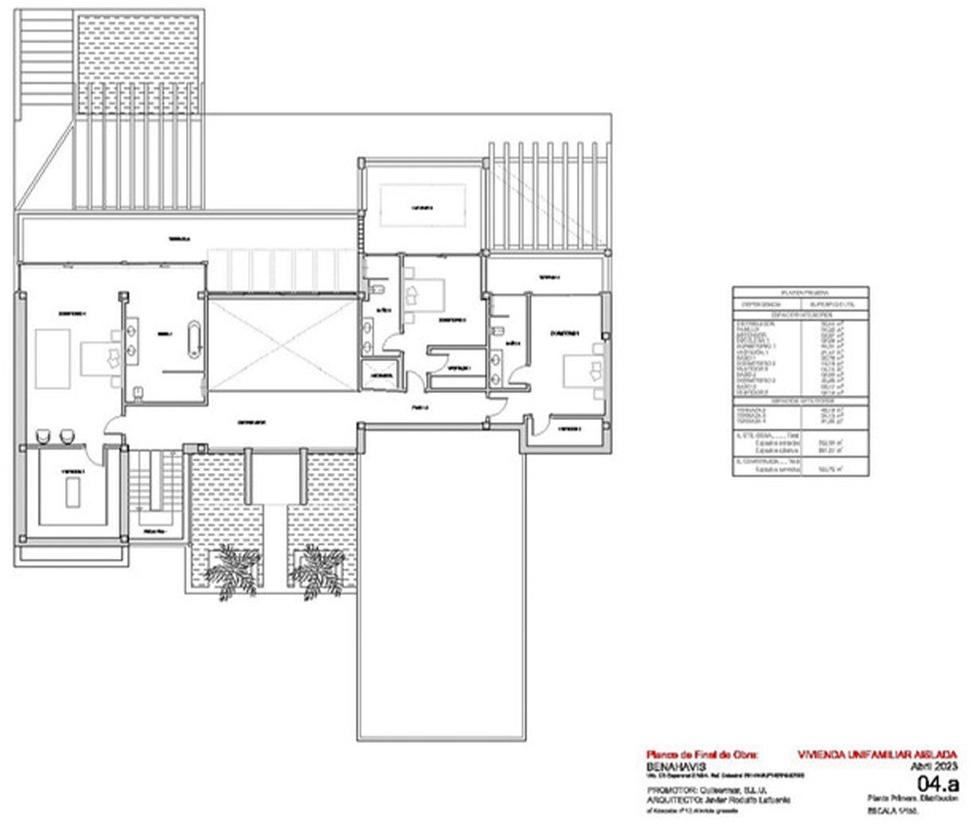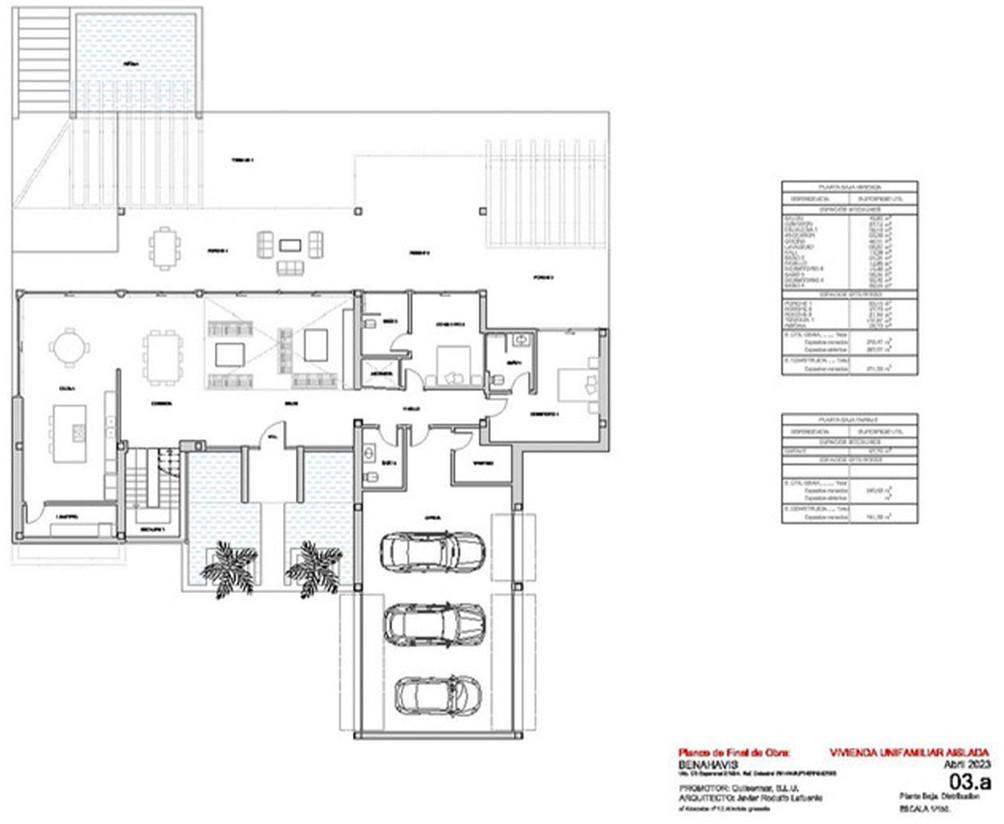 On the right side of the entrance, two en-suite bedrooms and a garage, capable of accommodating 3-4 cars and a golf buggy, are located. Noteworthy is the garage's glass wall, allowing you to admire your collection from outside.