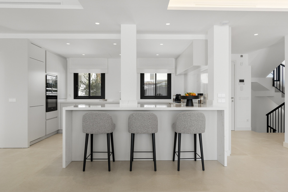 Step inside Casa Rosario to discover a haven of comfort and style, with underfloor heating all throughout the villa adding to the numerous luxurious amenities. The entrance level features a spacious living area, kitchen, and dining room, all seamlessly connected for effortless living. Floor-to-ceiling glass doors flood the space with natural light and open onto a spacious terrace, where residents can enjoy al fresco dining or simply soak in the Mediterranean ambiance. On the terrace outside, the heated pool has been tastefully extended for year-round enjoyment. The rejuvenating jacuzzi, rainfall shower, and inviting dining area, with a fitted BBQ grill, complete the outdoor oasis, promising moments of bliss under the Spanish sun. The villa boasts five bedrooms, each with its own ensuite bathroom, two of which are found on this level.
