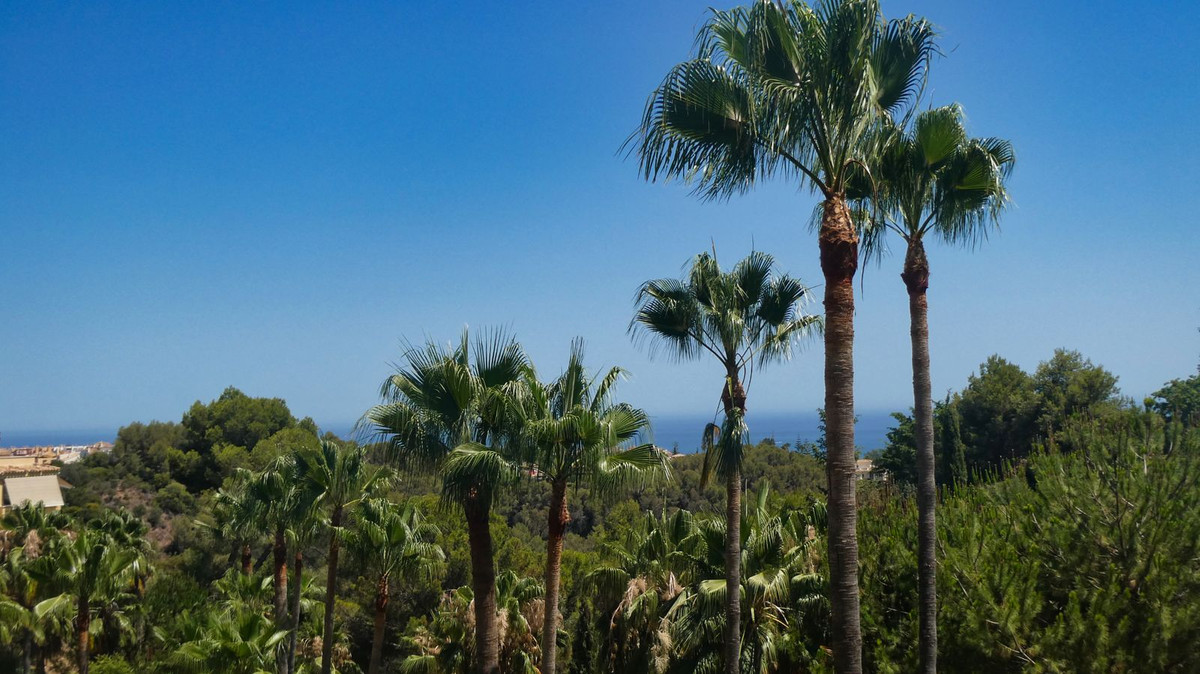 Situated on the ground floor, the apartment boasts a spacious, partly covered terrace offering privacy and stunning panoramic views over the lush gardens with palm trees and the Mediterranean Sea in the distance. Inside, you'll find a welcoming entrance hall, a modern kitchen with Siemens appliances, a cozy breakfast corner, and a separate terrace. The master bedroom has direct access to the main terrace and features a luxurious en-suite bathroom. The guest bedroom also includes an en-suite bathroom and terrace access. The lounge, complete with a fireplace, opens onto the main terrace, ideal for dining, lounging, and sunbathing. Additional features include marble floors, full air conditioning, a videophone, an alarm system, and electric shutters. The property also offers convenient access to an underground garage with ample parking and a spacious storage room.