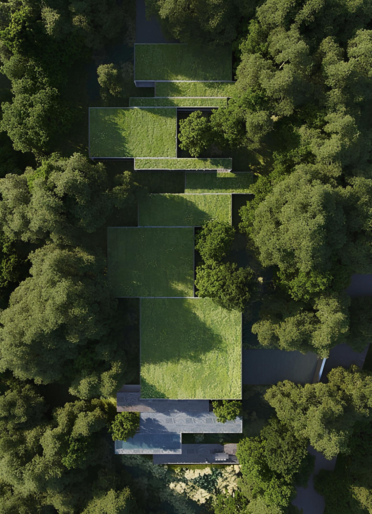For those who cherish outdoor living, the villa offers an 11-meter-long outdoor swimming pool, perfectly positioned on the lower level above the guest house. The pool's design follows the structure of the home, making it ideal for both leisure and sports, with a total surface area of 48 m². A striking 73 m² walk-in water mirror leads to the pool, enhancing the ambiance with a refreshing sense of light and tranquility. Inside, the villa's wellness area spans 152 m² and includes a heated swimming pool, a gym, and a sauna. The heated pool, naturally illuminated by a skylight, complements the sports facilities, ensuring year- round well-being.