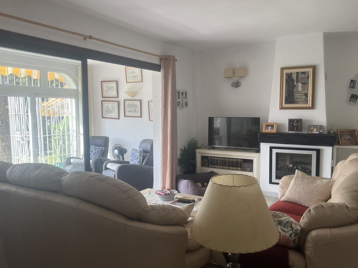 Inside, the spacious, light-filled interiors include a cozy fireplace, an updated kitchen with a practical enclosed laundry area, and fully renovated bathrooms. The south-facing covered terrace provides a relaxing space to enjoy the Mediterranean climate year-round. The gated complex features communal parking and a secure, tranquil setting.