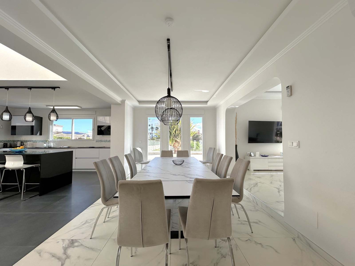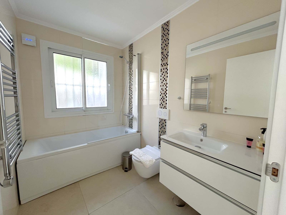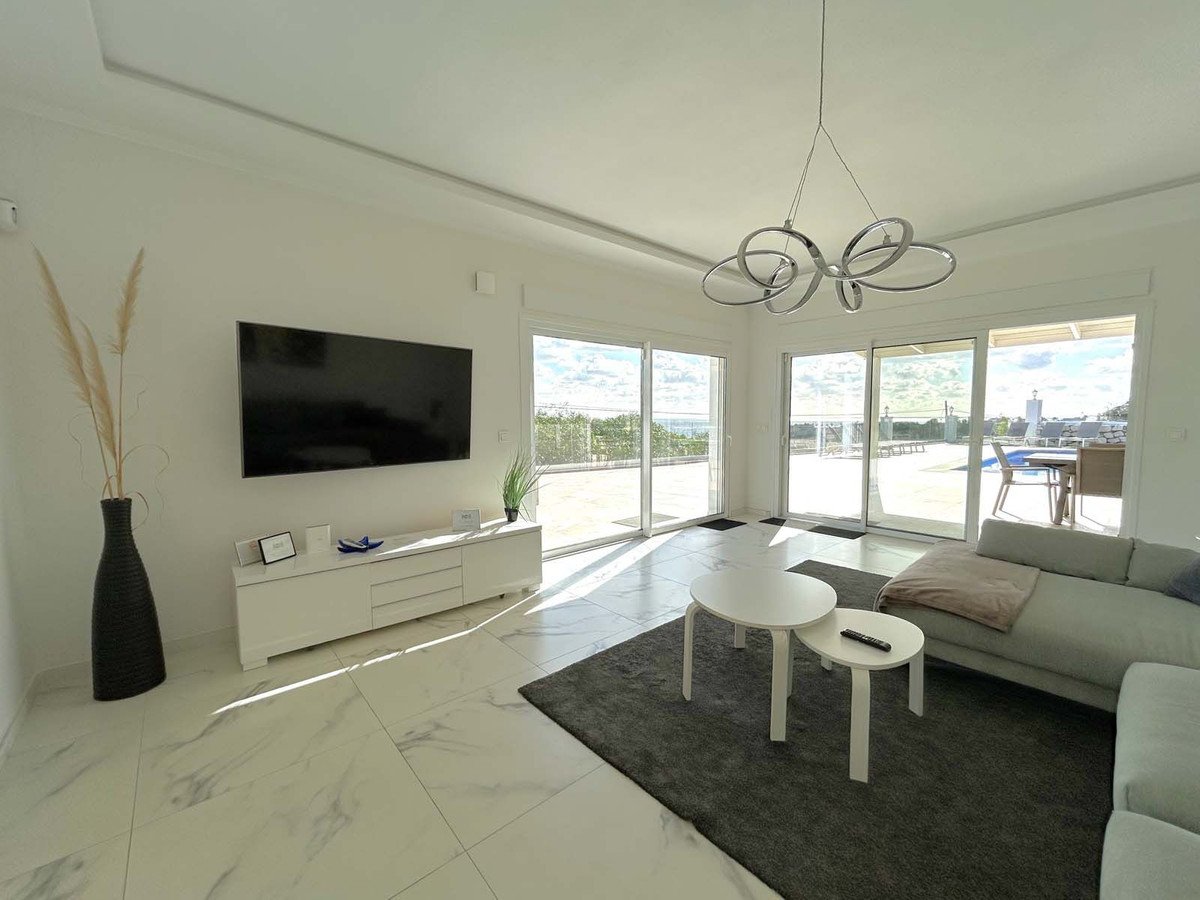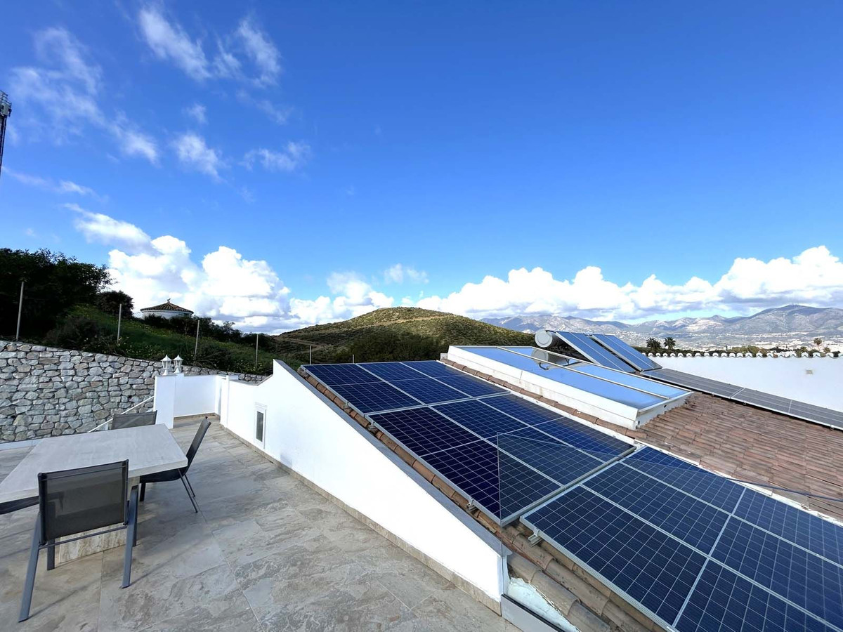 The spacious villa features six bedrooms, each with an ensuite bathroom, a fully equipped kitchen, and a separate guest apartment with its own kitchen, bedroom, bathroom, and living room. Outdoor spaces include large terraces, gardens, a solarium, a heated pool, and an outdoor dining and barbecue area. The villa also boasts air conditioning, underfloor heating, and solar panels for power and water heating.