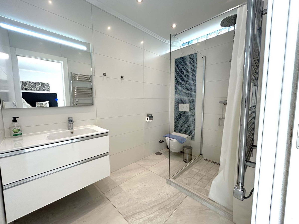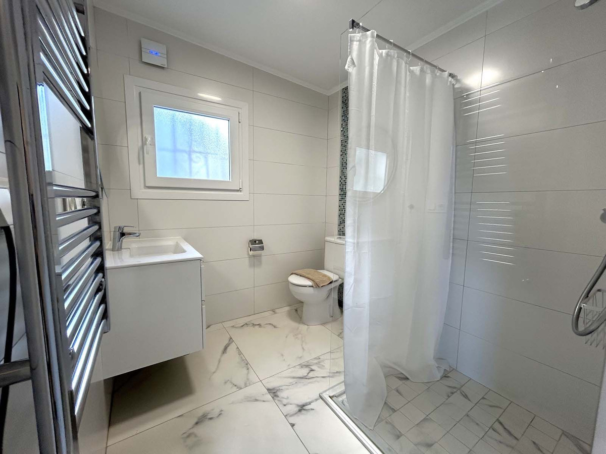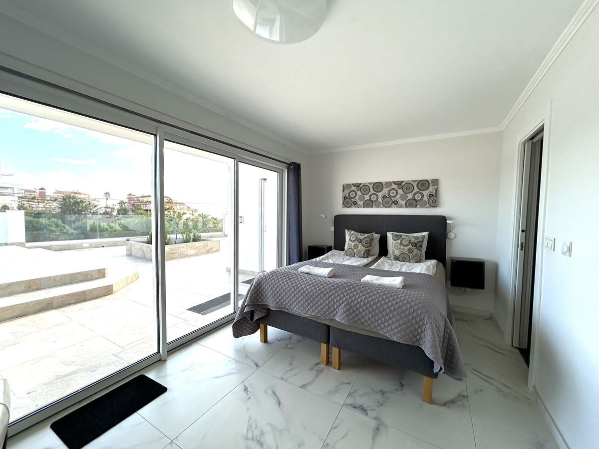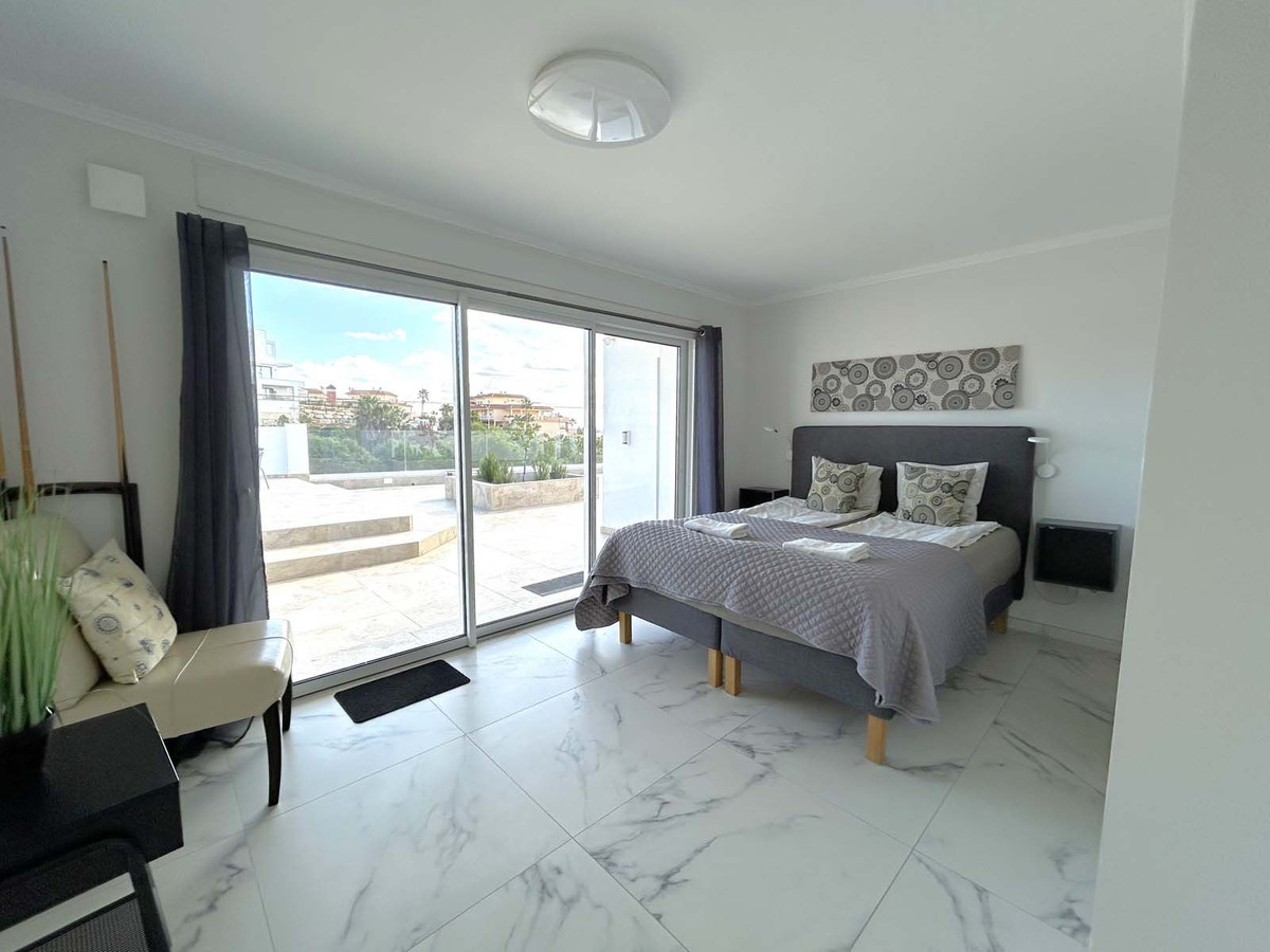 The spacious villa features six bedrooms, each with an ensuite bathroom, a fully equipped kitchen, and a separate guest apartment with its own kitchen, bedroom, bathroom, and living room. Outdoor spaces include large terraces, gardens, a solarium, a heated pool, and an outdoor dining and barbecue area. The villa also boasts air conditioning, underfloor heating, and solar panels for power and water heating.