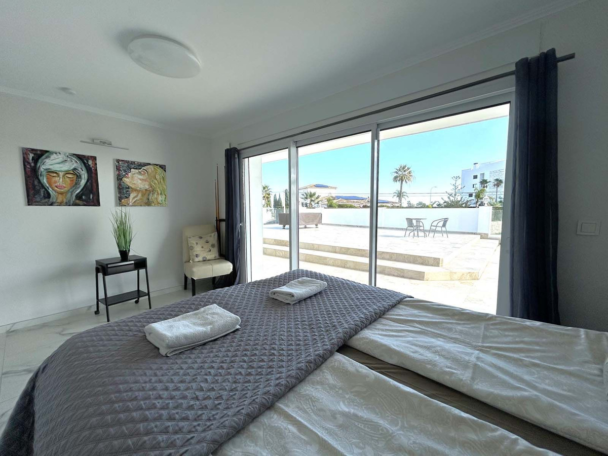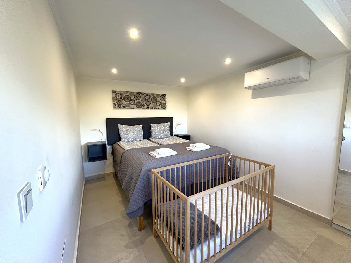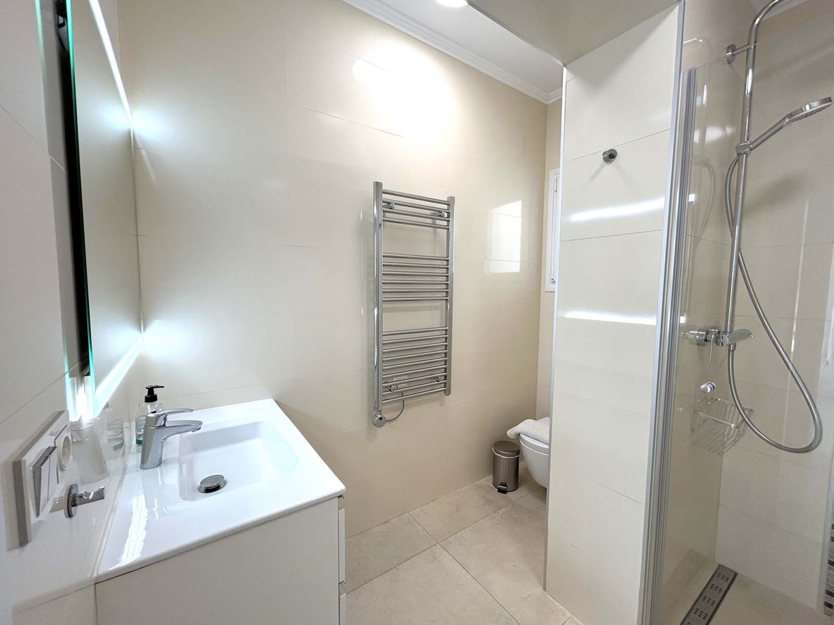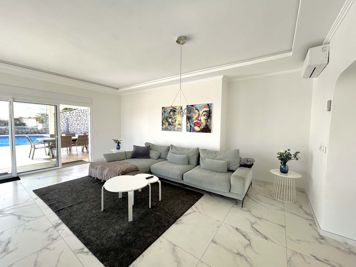 The spacious villa features six bedrooms, each with an ensuite bathroom, a fully equipped kitchen, and a separate guest apartment with its own kitchen, bedroom, bathroom, and living room. Outdoor spaces include large terraces, gardens, a solarium, a heated pool, and an outdoor dining and barbecue area. The villa also boasts air conditioning, underfloor heating, and solar panels for power and water heating.