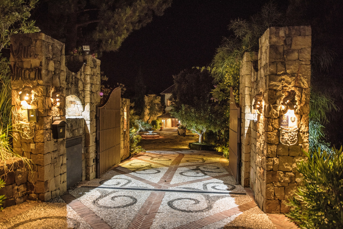 The main house, a splendid Spanish villa, climbs behind the pompous natural stone-built driveway with fountains. Master Bedroom with luxurious marble bathroom and terrace with distant views, 4 further bedrooms with terraces and marble bathrooms and 2 children's rooms with shared bathroom. Spacious living spaces with charming and cosy furnishings completes the Spanish flair. In total, the house also has 6 terraces, kitchen, 2 garages for 4 cars, a spacious and fully equipped fitness center and a beautiful pool landscape with 2 differently tempered pools and a whirlpool. The beautiful green garden leads to a built in the hillside glass studio / yoga / meditation house and a children's playground.