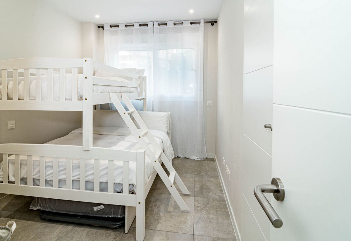 New to the market, this wonderful ground-floor apartment with 3 bedrooms and 2 bathrooms is fully furnished and ready to move into. It has two terraces, one covered and the other facing uncovered. It also includes a parking space and a storage room. Located in a gated community with a communal pool, gardens, a kids' area, an outdoor gym, a chill-out area, and a bar. Its location is ideal, just a few meters from Marbella's Paseo Maritimo and a short walk to the popular Plaza de los Naranjos in Marbella's historic center.