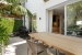 The interior design is distinguished by premium wood and marble finishes, highlighting meticulous craftsmanship in every detail. The ground floor showcases an open-plan layout where the living, dining, and kitchen areas merge harmoniously, creating an inviting space filled with natural light. The kitchen, fitted with state-of-the-art Gaggenau appliances, is as stylish as it is practical, offering a seamless cooking experience. Extending from this area is a private patio, ideal for alfresco dining and relaxation. The sophisticated living area is accentuated by refined herringbone wooden floors and a neutral color palette, enhancing the overall sense of warmth and sophistication.