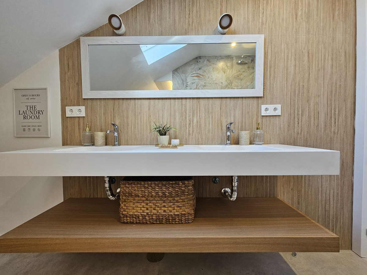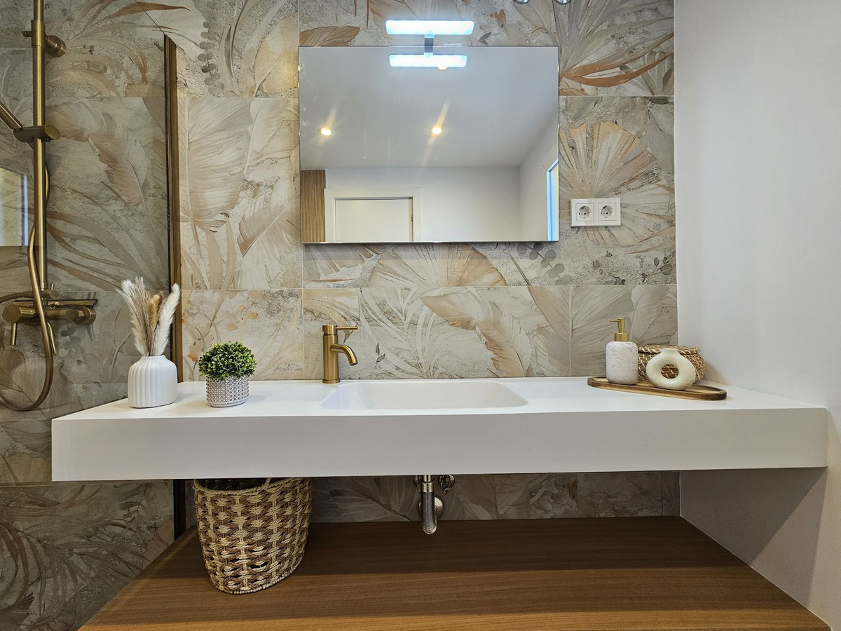 On the ground floor, you will find an elegant open-plan living room with an integrated kitchen, a cozy bedroom, and a modern bathroom. From here, you access a stunning partly covered terrace with a chill-out area and a private pool, ideal for enjoying sunny days. The entrance to the home also has another small outdoor space. The first floor offers two more bedrooms, with a private terrace at the master bedroom and a second bathroom, perfect for everyone's comfort. The private and closed double garage is located in the basement.