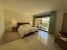 The master bedroom includes a large en-suite bathroom and a dressing room, with direct access to the garden through expansive windows. The other two bedrooms are situated at the back of the apartment and share a bathroom.