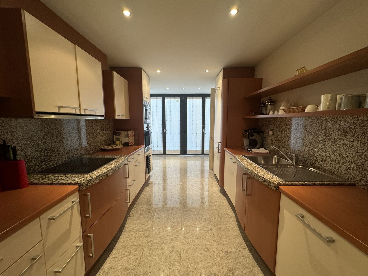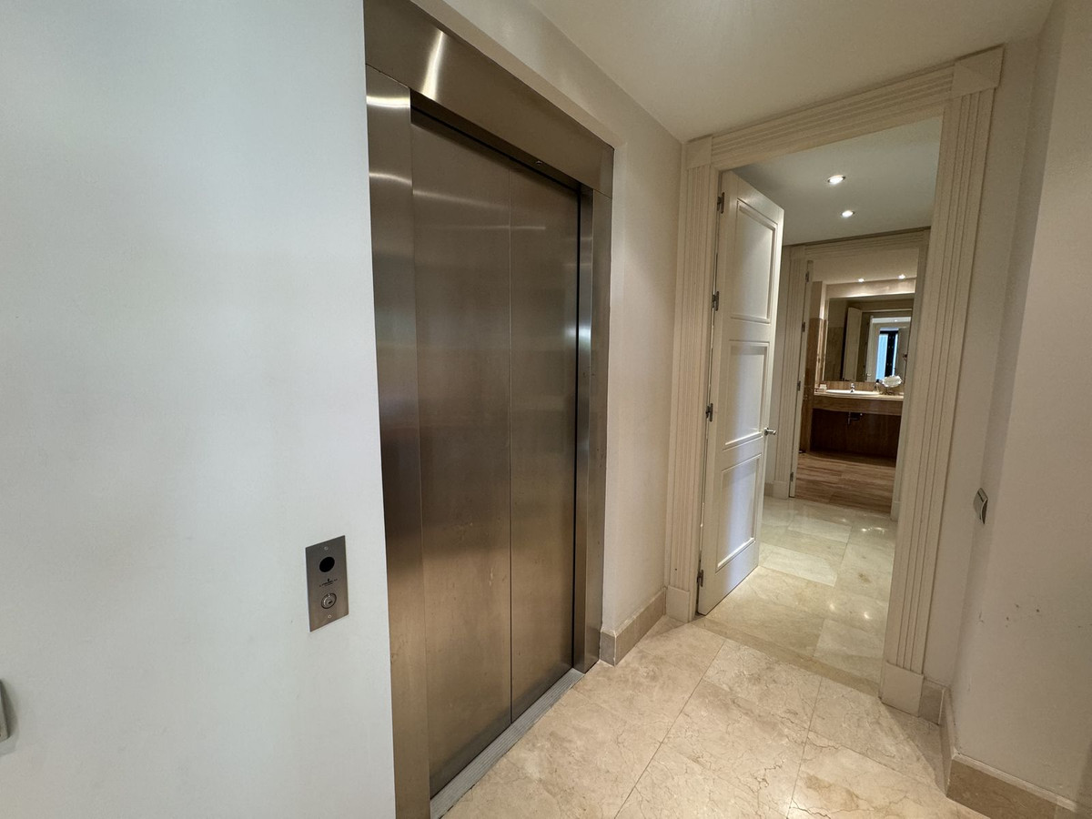 The apartment also features a guest bathroom and a private elevator. It comes with a parking space and a storage room located in the basement, accessible by the private elevator.