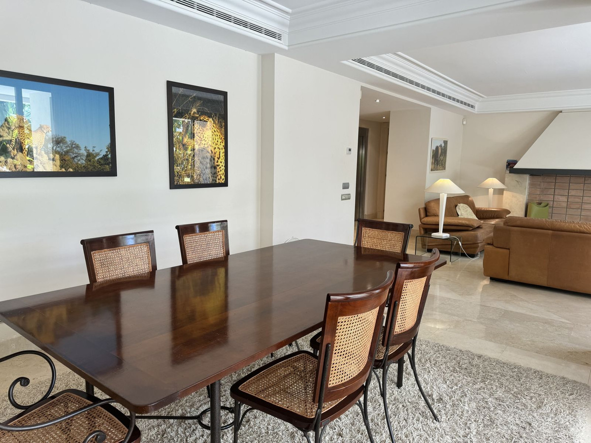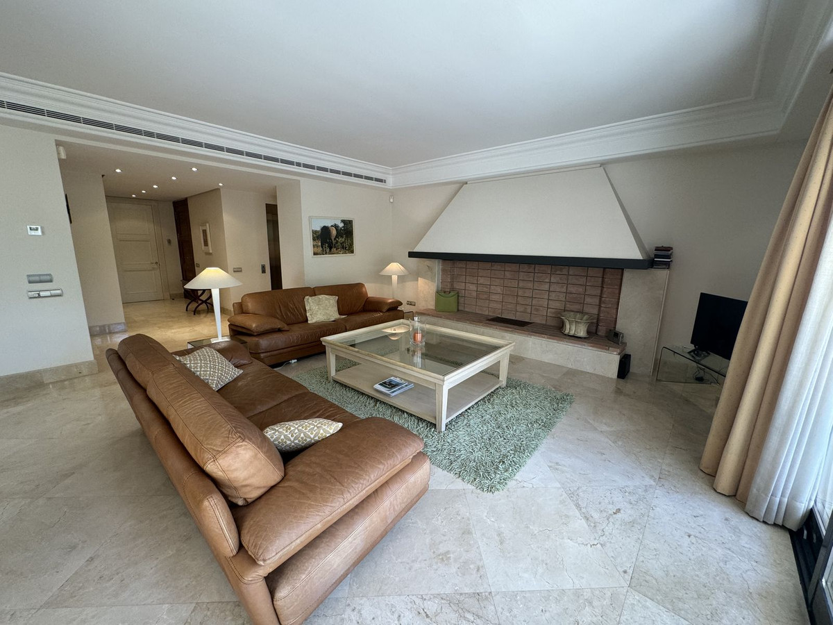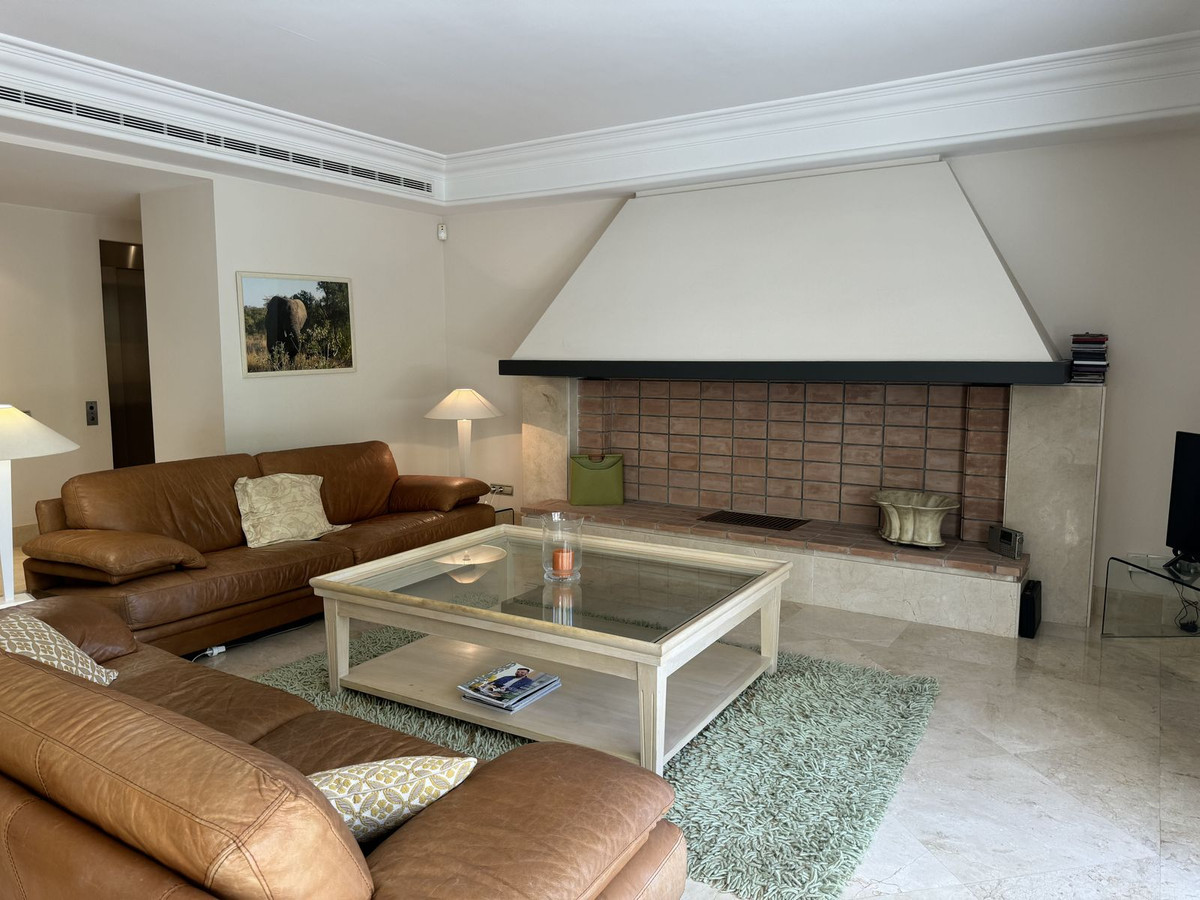 The apartment boasts a spacious living room with a fireplace and a dining room, both of which open onto a magnificent 70 m² terrace. This terrace includes a private sunny garden surrounded by tropical plants, ideal for outdoor relaxation.