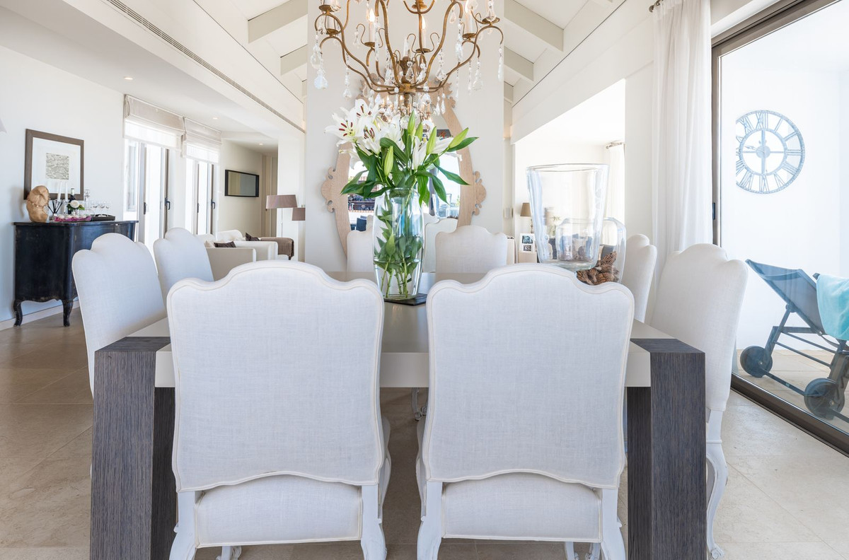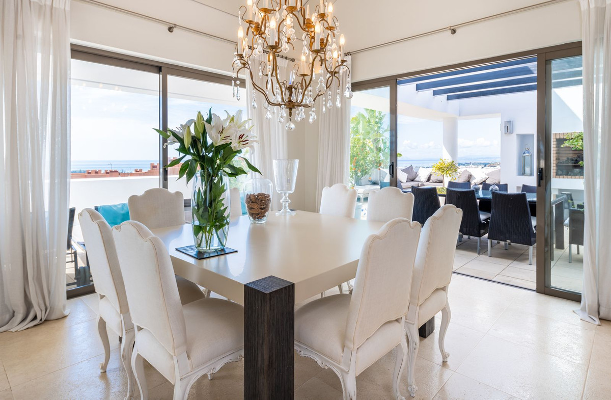 The luminious 212 m2 interior is surrounded by spacious; 95m2 terrace. The elegant living and dining area, featuring a contemporary fireplace, extends onto a vast terrace that captures breathtaking views stretching to Gibraltar—ideal for outdoor entertaining or serene relaxation.