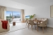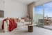 The bright, open-plan living area features a comfortable sofa and armchairs that flow seamlessly onto a spacious south-facing terrace, overlooking the beautifully maintained gardens and offering partial sea views an ideal space for relaxing, dining, or enjoying the sun.