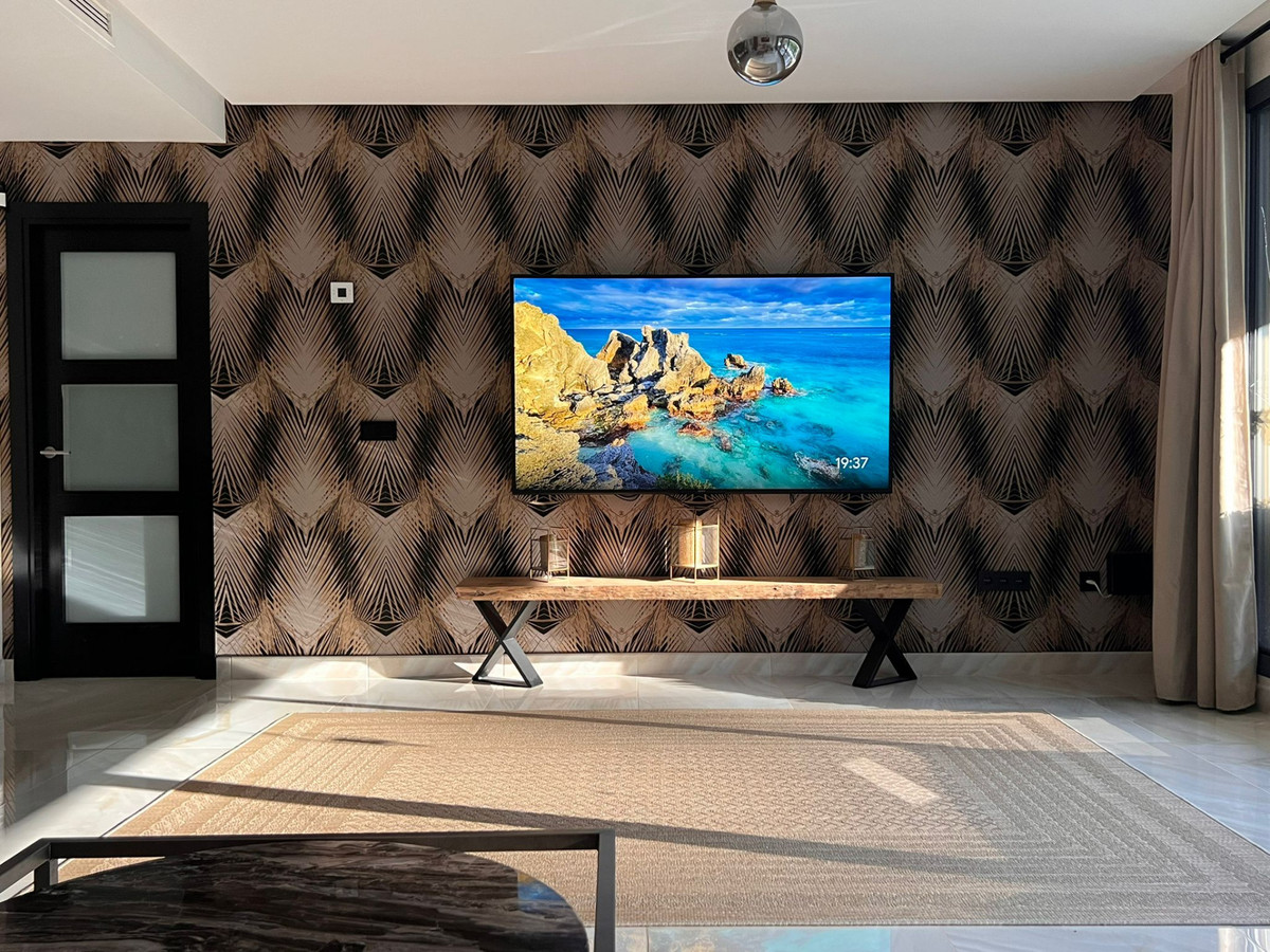 With over 100 m² of interior space, it features 3 spacious bedrooms, 2 fully upgraded bathrooms with premium finishes, and a very private 45 m² sun-drenched terrace boasting panoramic views of surrounding mountains. Every detail has been carefully selected, including a designer kitchen equipped with Bosch appliances, a BORA hob with integrated extractor, and a high-end countertop. The living room is elegantly finished with Cavalli wallpaper, enhancing the luxurious feel of the space.