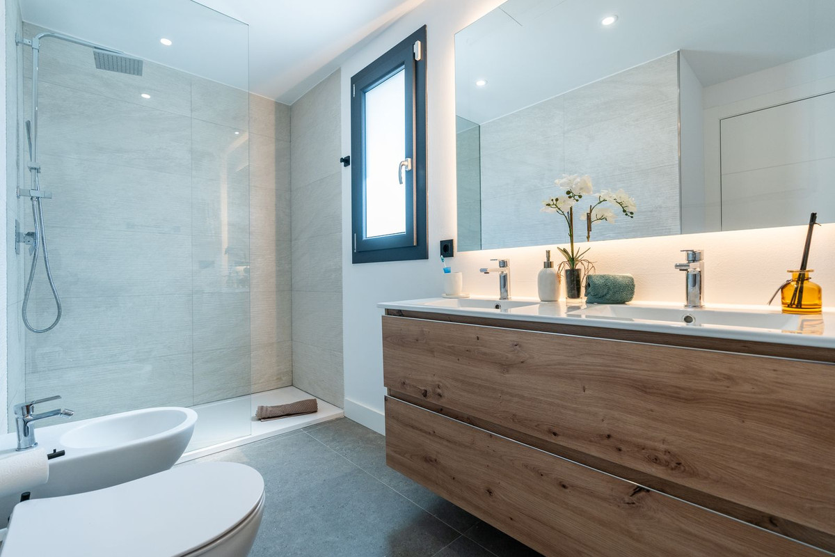 Walk in the front door and to the left of the front door you have a really nice stairway with a feature chandlier over two floors. Here you have a fabulous open plan kitchen/sitting/dining room with floor to ceiling windows and a picture through each one. Also on this floor you have a double bedroom ensuite and also another downstairs toilet. The sitting room leads out to a covered terrace. Upstairs you will find two more double bedrooms ensuite and one with an ultar modern design and layout. From the landing here you have Access to the solarium.