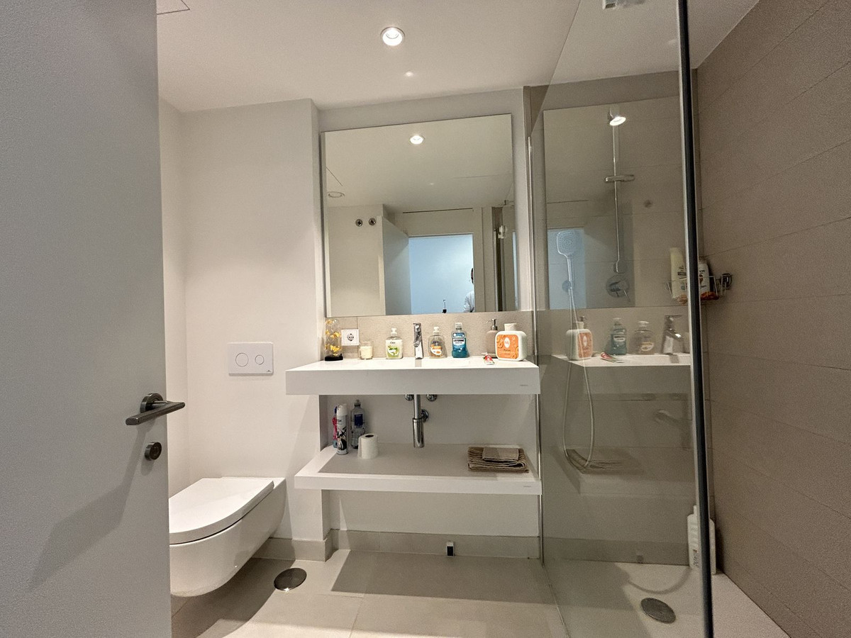 The apartment includes 2 bedrooms and 2 bathrooms. One of the 10 m² bedrooms has a built-in wardrobe. The master bedroom is a 15 m² suite with a dressing room and a private bathroom divided into three spaces: a separate toilet, double sinks, and a large shower cubicle.