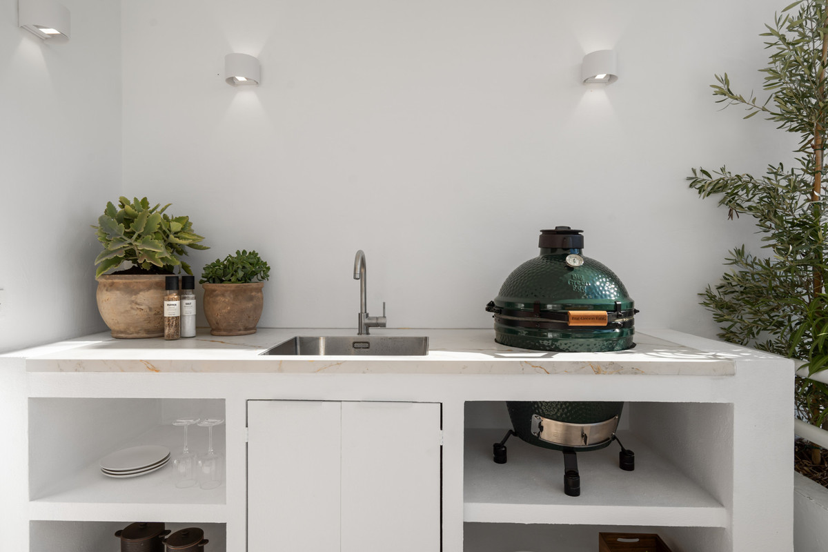 This renovated apartment is located in Alcores del Golf, a south-facing property with plenty of natural light and a clean, minimalistic design. The open-plan layout connects the living area with a modern kitchen, and the large terrace features a barbecue, dining area, and a relaxing outdoor space with views of the garden and greenery.