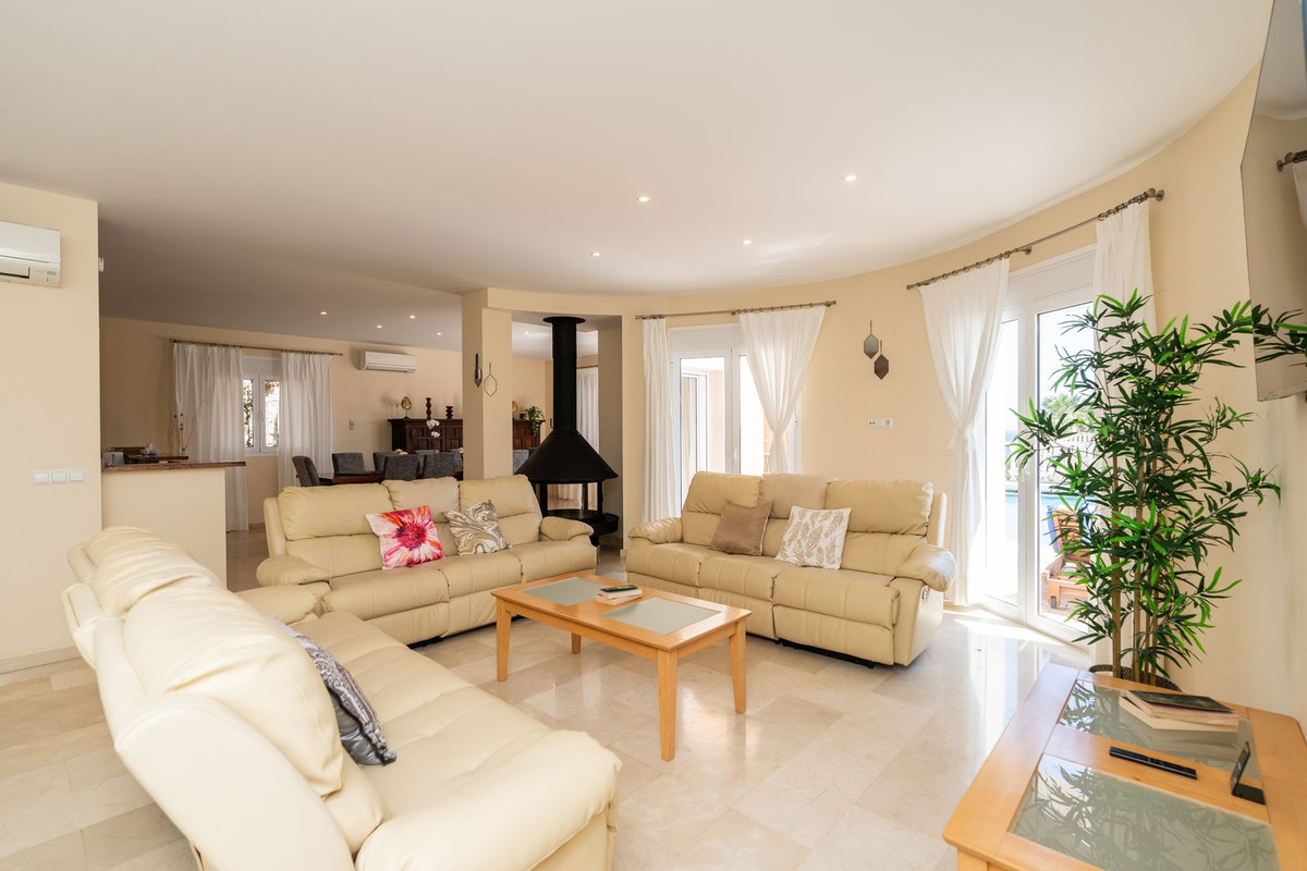 Completed in 2018, this three-story villa—all levels above ground—boasts traditional architecture and style throughout. The main level features a generous open-plan layout, seamlessly connecting the living room, dining space, and modern kitchen. These areas extend effortlessly to a heated swimming pool, equipped with a retractable cover, and a choice of sun-soaked or shaded terraces. Whether you're basking in the sun, dining al fresco, or enjoying panoramic sea views, every detail caters to luxurious coastal living. One en-suite bedroom completes this level.