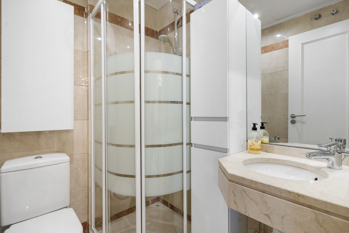 The apartment has 2 bedrooms and 2 bathrooms, where the master bedroom has an ensuite bathroom and also gives access to the terrace. One bathroom has a shower, and the other bathroom has a bathtub.