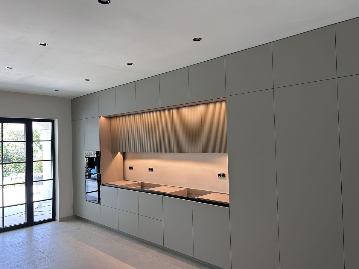 The modern kitchen is designed with the latest trends in mind and is equipped with a built-in two-door refrigerator, a wine cooler, and a cooktop with an integrated extractor, making it both aesthetically pleasing and highly functional.