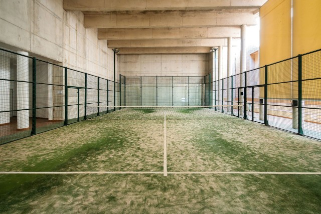 Piscines communes intérieure et extérieure, salle de sport moderne et terrain de padel
