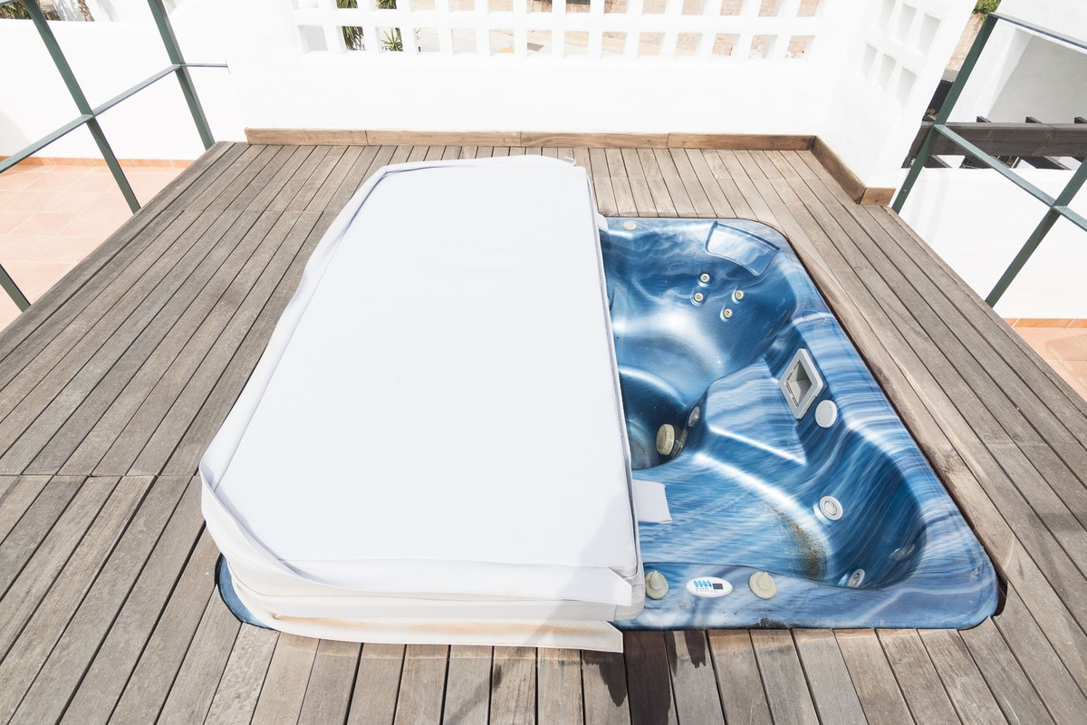 Within a pleasant residential complex where the apartments are distributed across 8 small blocks of three levels, this penthouse offers a spacious living room, a fully fitted kitchen with separate utility room, 3 bedrooms (one en-suite with its own bathroom and access to the terrace), a second full bathroom, and a beautiful large terrace of 47m² leading up to a 128m² solarium with pergola and jacuzzi, boasting breathtaking views of the golf course, the mountains, and the sea.