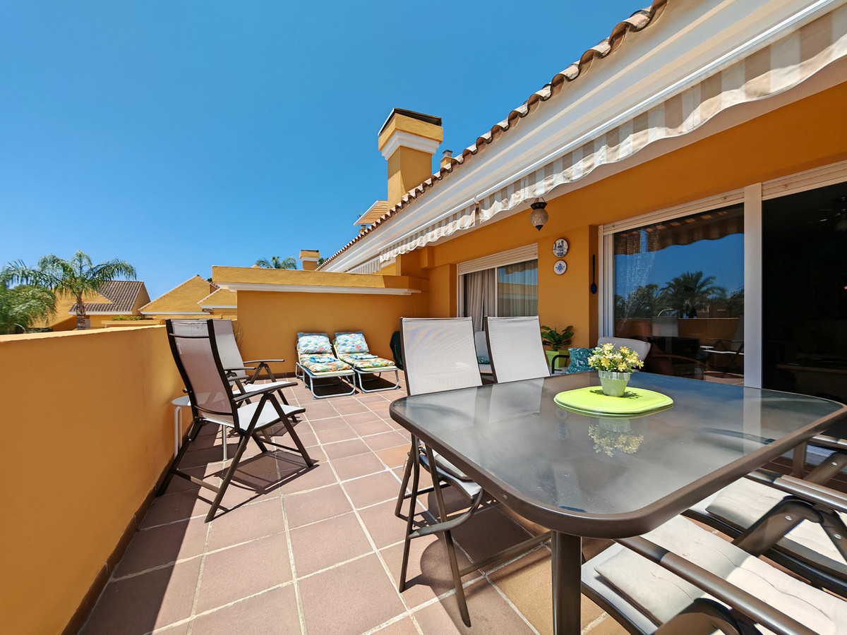 Apartment for sale in Elviria, Marbella with 3 bedrooms, 2 bathrooms and 1 on suite bathroom, with communal swimming pool, private garage and communal garden. Regarding property dimensions, it has 128 m² built, 108 m² interior and 20 m² terrace. Has the following facilities amenities near, transport near, air conditioning, fully fitted kitchen, marble floors, storage room, private terrace, kitchen equipped, sea view, internet - wi-fi, gated community, pool view, beach side, close to children playground, close to sea / beach, uncovered terrace, good condition, ceiling cooling system, ceiling heating system, close to shops, close to town, close to schools and surveillance cameras.
