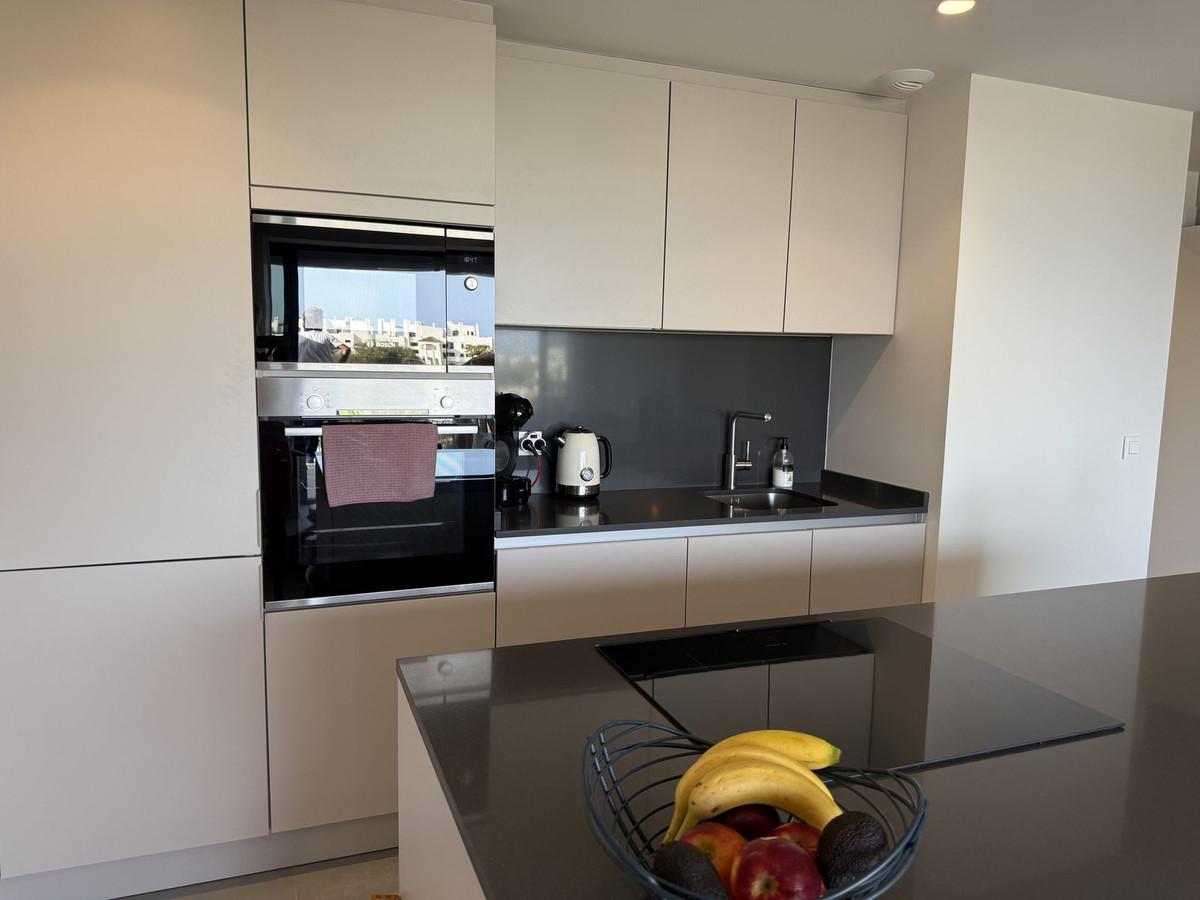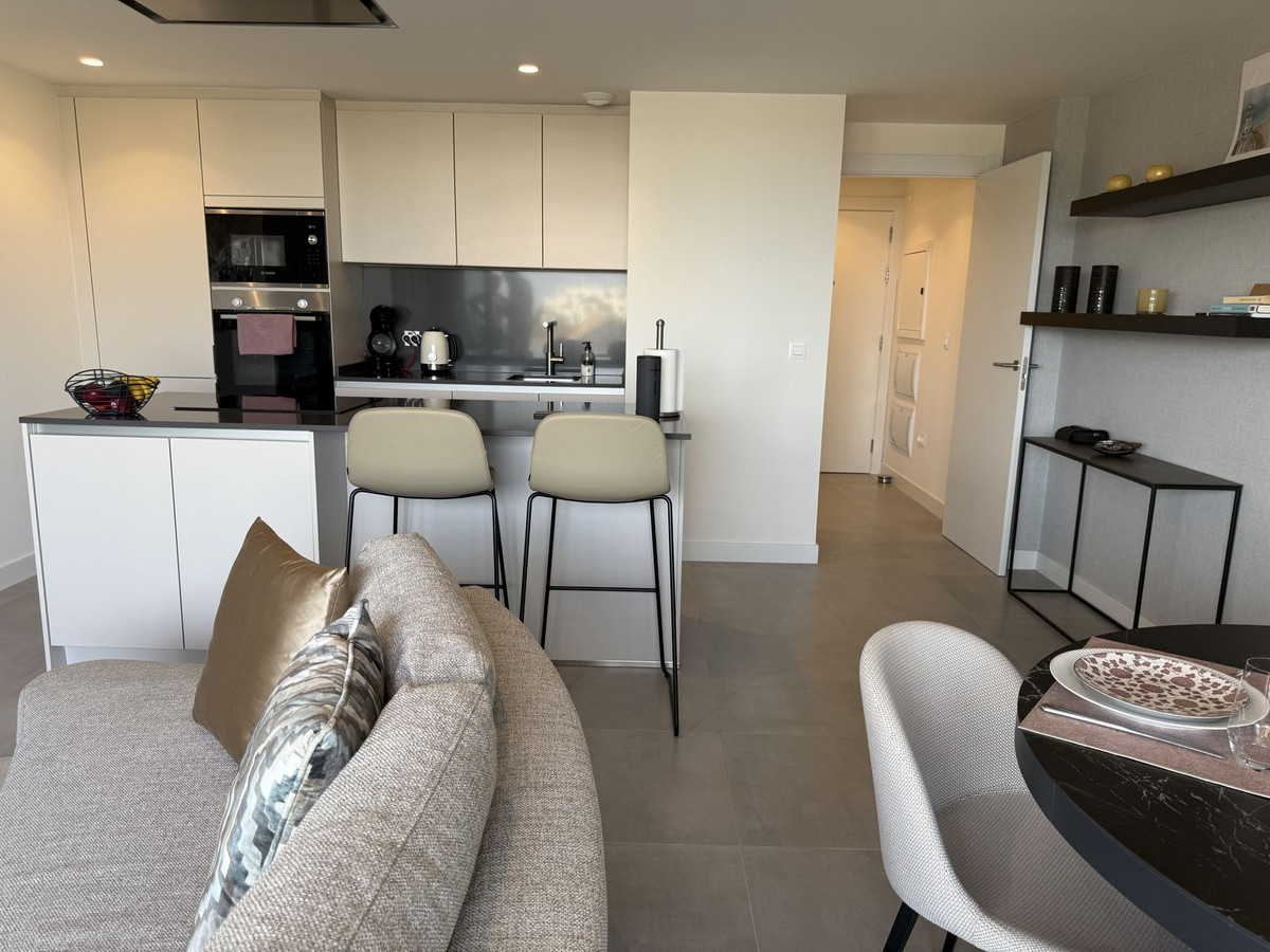 The interior living space of 102 m² flows naturally into a spacious 28 m² terrace that faces southwest, ensuring sun from late morning until sunset. The layout includes an open-plan living and dining area with large sliding doors that open directly onto the terrace. The fully equipped kitchen is centered around a sleek island with integrated induction hob, combining elegance and functionality in a space designed for both cooking and socialising.