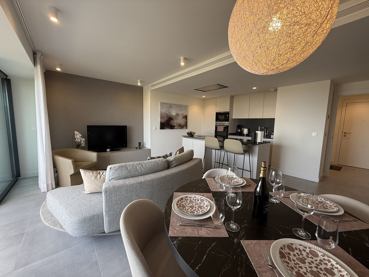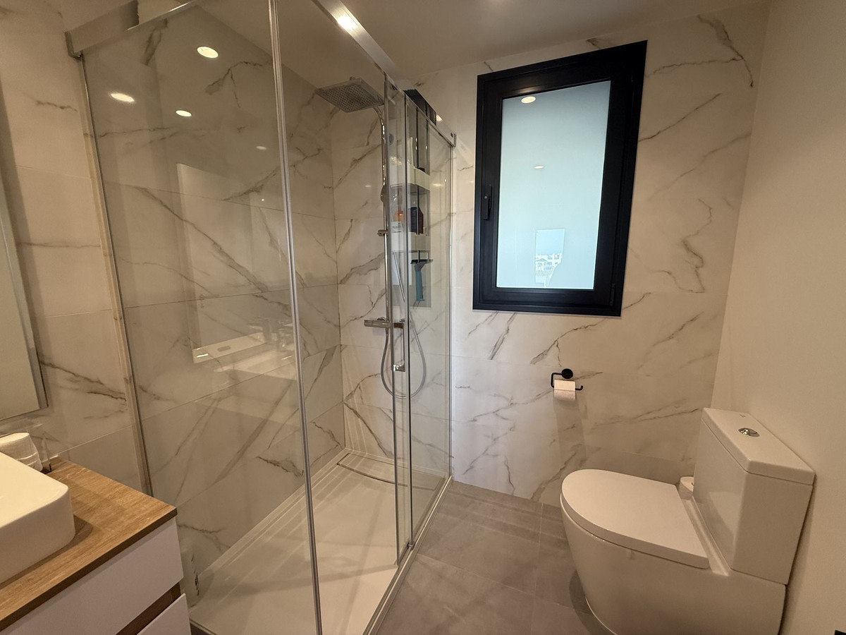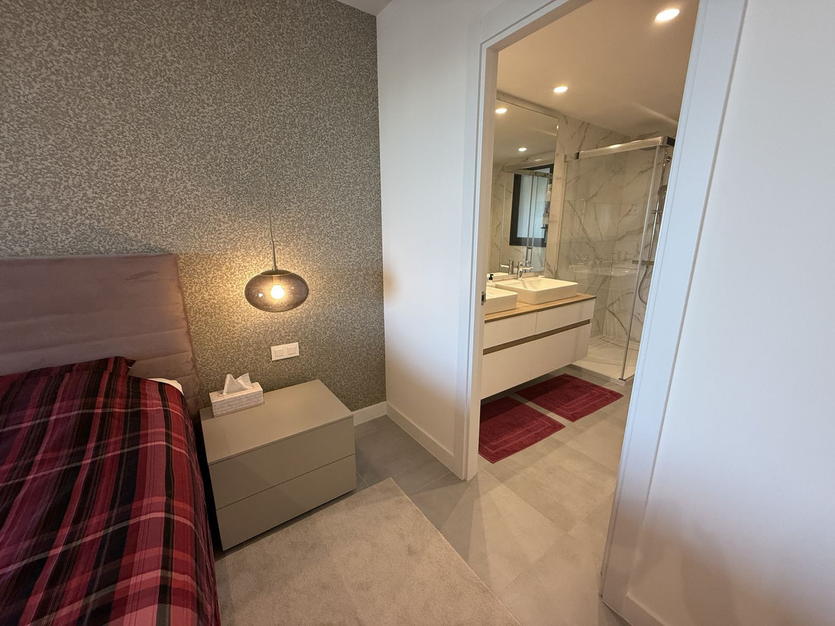The master bedroom offers direct access to the terrace and enjoys spectacular views of the sea – a rare and privileged feature. The second bedroom is also generously sized, and both bathrooms are equipped with walk-in showers and finished in a modern, minimalist style. Throughout the apartment, high-quality materials, tasteful decoration, and abundant natural light create an atmosphere of calm and understated luxury.