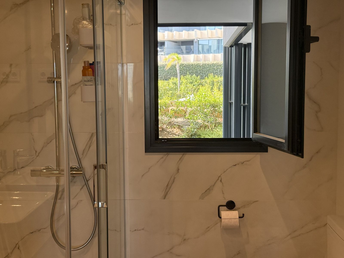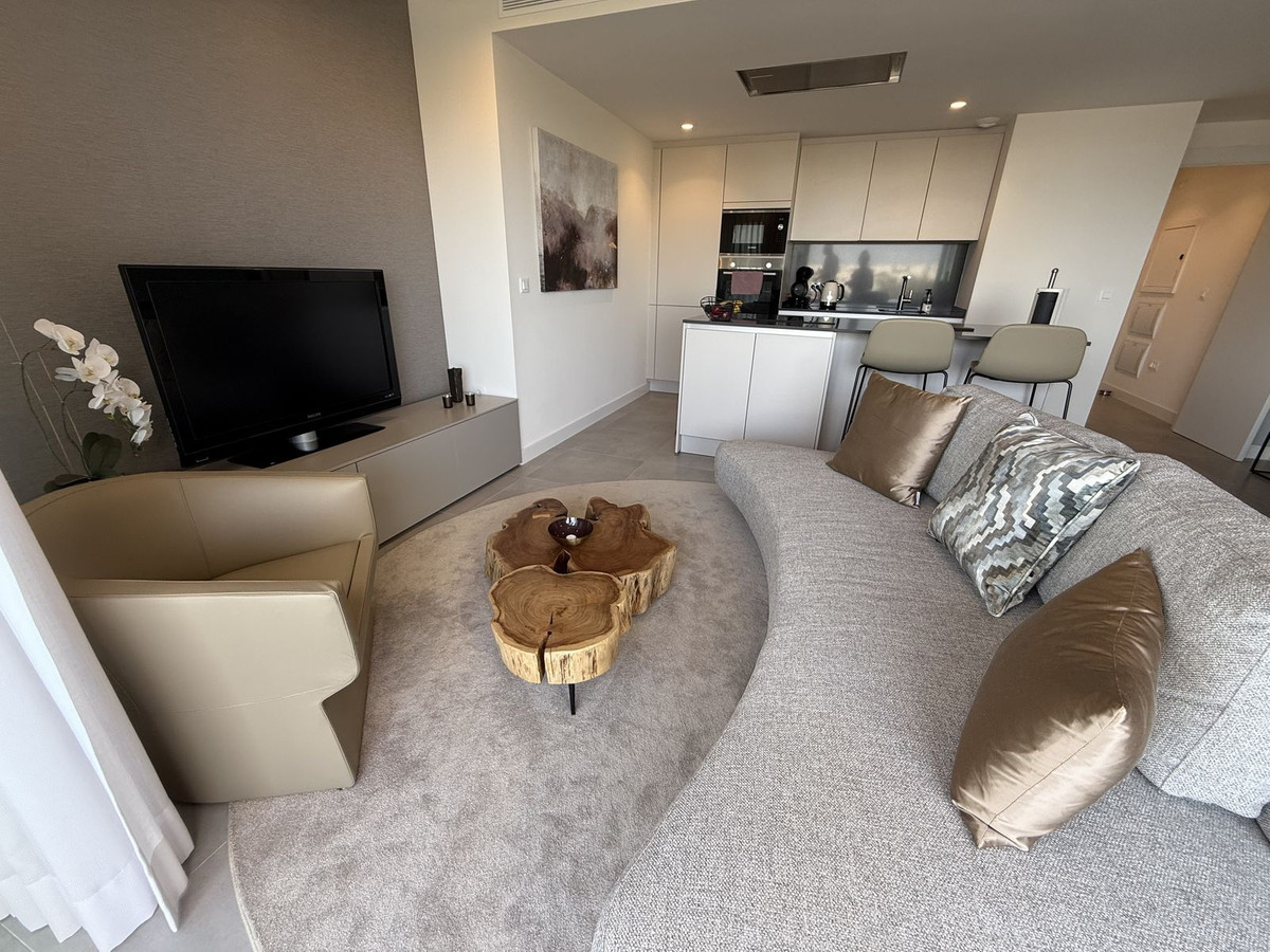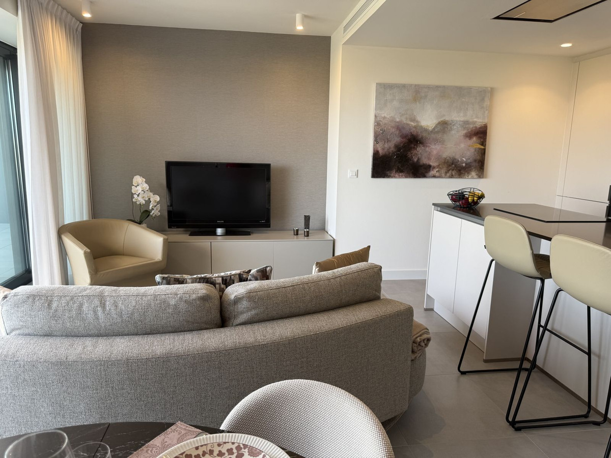 The master bedroom offers direct access to the terrace and enjoys spectacular views of the sea – a rare and privileged feature. The second bedroom is also generously sized, and both bathrooms are equipped with walk-in showers and finished in a modern, minimalist style. Throughout the apartment, high-quality materials, tasteful decoration, and abundant natural light create an atmosphere of calm and understated luxury.