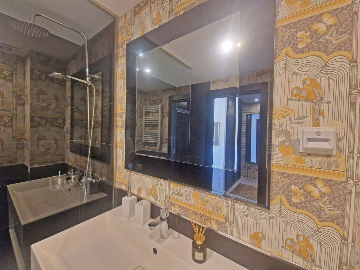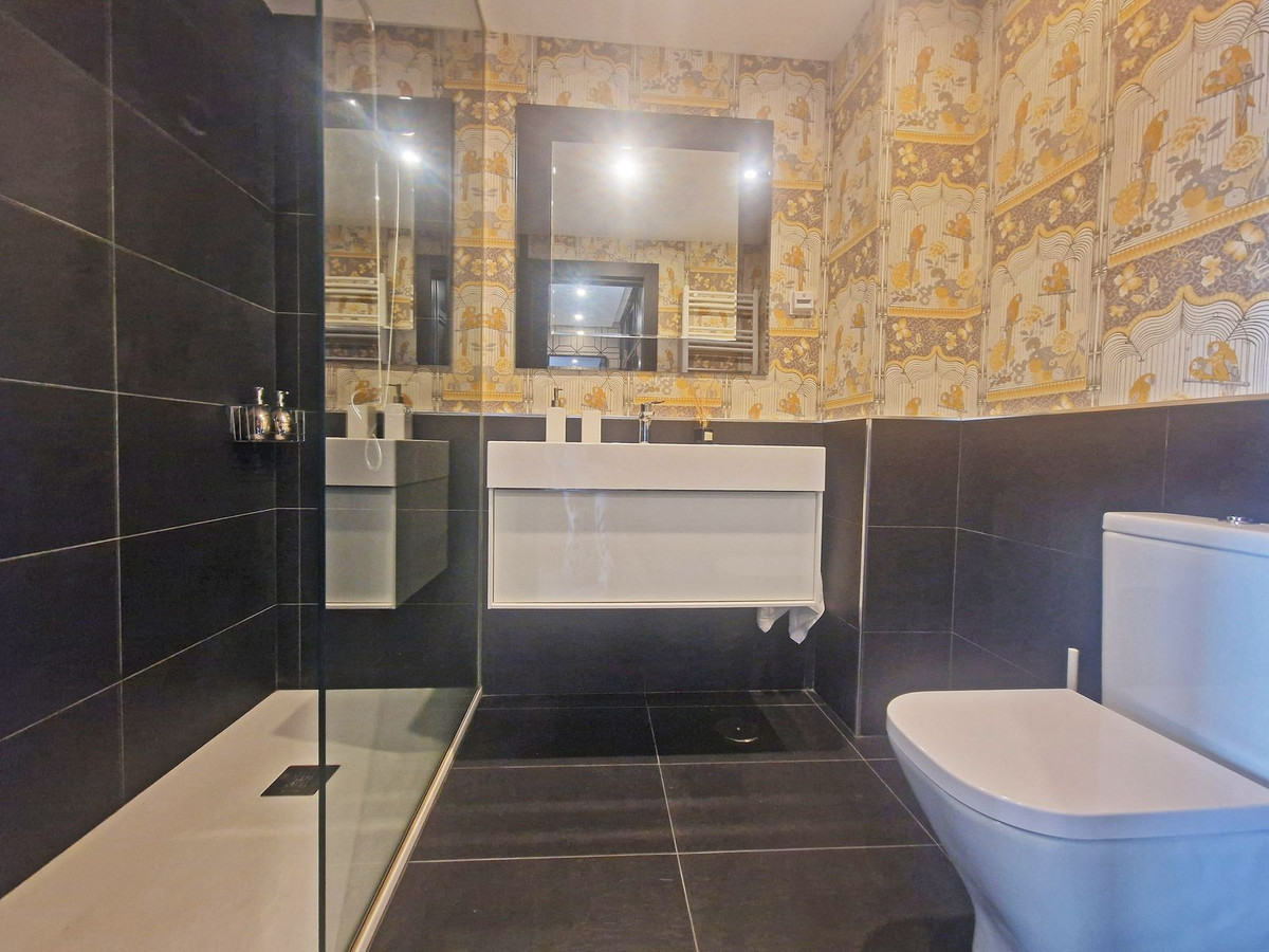 The kitchen has been completely modernized and opens onto the dining area, making it an integral and inviting part of the living space. A stylish guest toilet adds further convenience on this level.