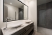 Descending into the main living floor reveals a layout designed for fluid movement and connection. The open-plan design integrates spacious living and dining areas, centered around a custom kitchen accented by a striking natural stone island. A side dirty kitchen supports larger entertaining needs without intruding on the clean aesthetics of the main space. Floor-to-ceiling windows welcome an abundance of natural light and create an uninterrupted visual link to the outdoor infinity saltwater pool. Surrounded by mature landscaping and tropical plants, this pool area embodies an atmosphere of privacy and leisure. The main floor also includes an en-suite guest bedroom, providing comfort and accessibility for visitors, while integrated ceiling sound systems and a pre-installed domotic setup ensure the space is ready for modern smart living.