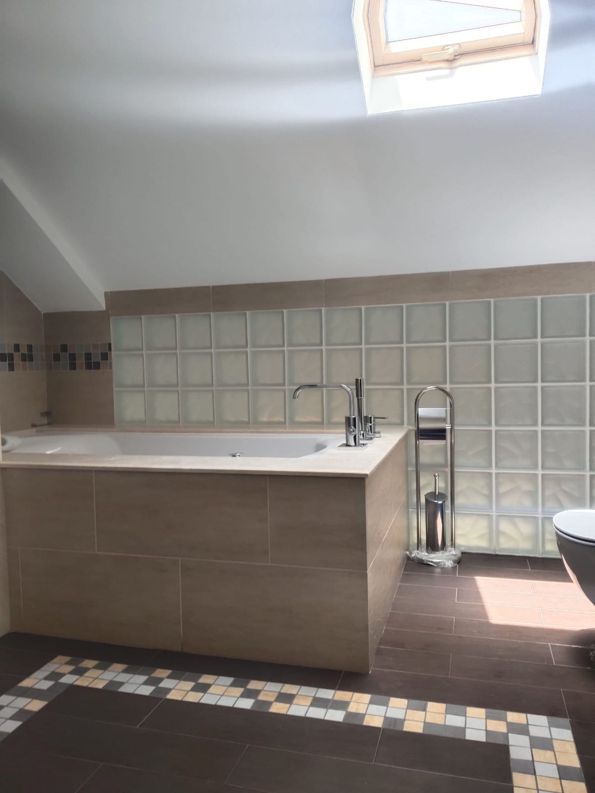 The living-dining room is very well organised, large, spacious, with a modern square fireplace, which divides the living-dining room and the living area.