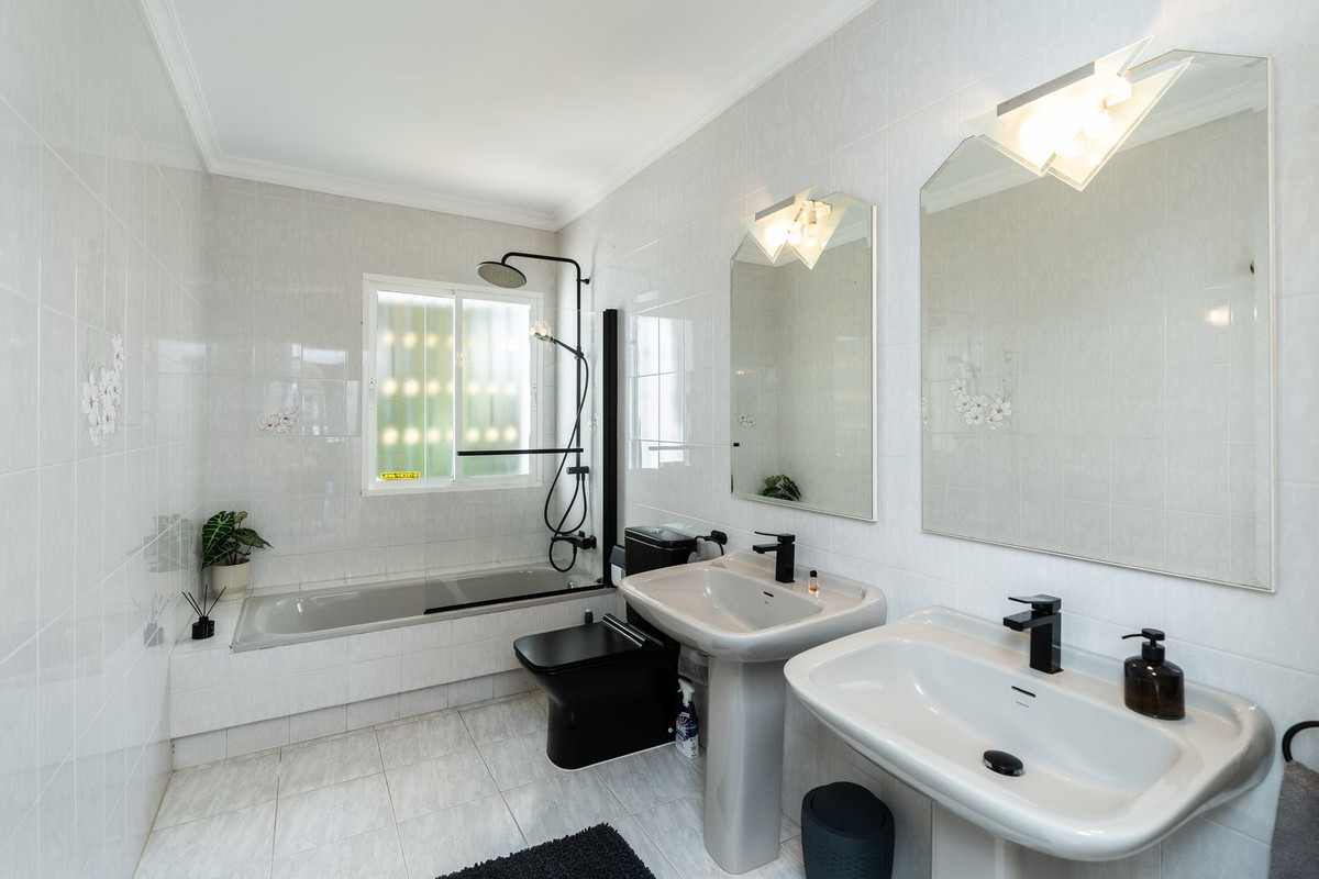The villa is entered through imposing wrought iron gates with a driveway leading into a large 4 car garage. The main living area is located on the first floor and comprises a huge living and dining area with access out to the terraces and the swimming pool with sea views. The kitchen has been recently refurbished and also has a dining area and sea views with utility room off the side. There are 3 very large bedrooms, all with en-suite bathrooms as well as a guest toilet. Upstairs, the master bedroom suite occupies the whole space with an impressive bedroom and private terrace to enjoy the sea views. The bathroom is something to behold with a jacuzzi bath, twin vanity units and a separate room with a huge walk in shower. Outside, the 10m x 4m swimming pool is perfectly connected to the main terrace and the house, ideal for entertaining or watching over younger family members. A lawn garden is located to the side and behind the house and is easily manageable.