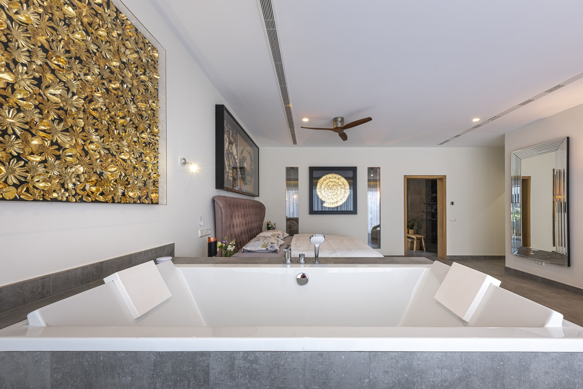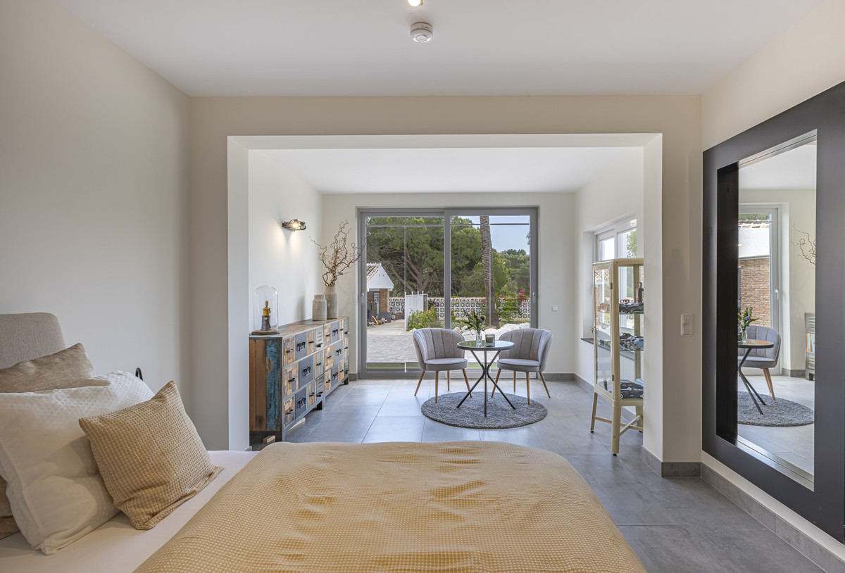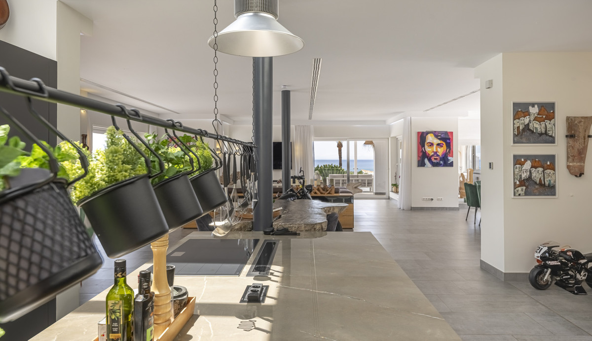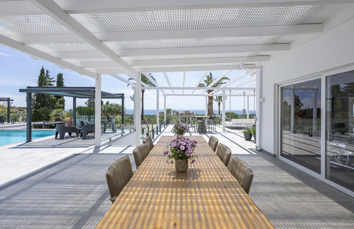 Inside, the villa feels bright, open and welcoming. The heart of the home is the spacious living room, designed with floor-to-ceiling glass doors that open directly onto the terrace, framing fantastic views of the sea and surrounding greenery. Natural light floods in from all angles, creating a warm and inviting atmosphere. The contemporary kitchen with breakfast area flows naturally into this space, making it ideal for family life and entertaining. There are four deluxe bedrooms, including a main suite with indoor and outdoor showers.