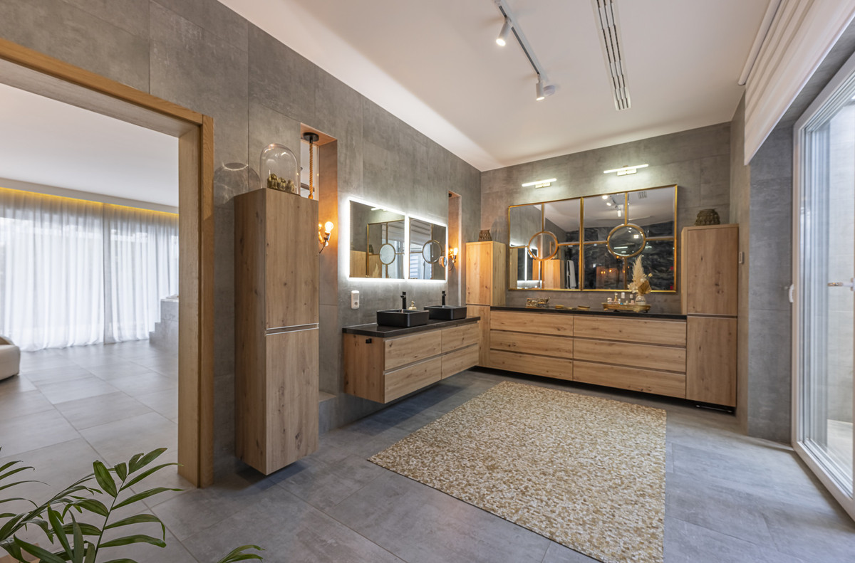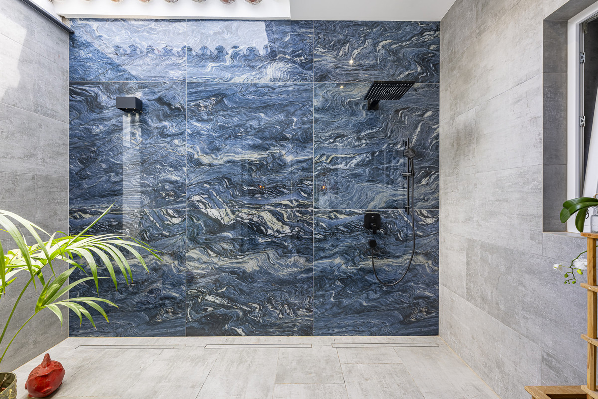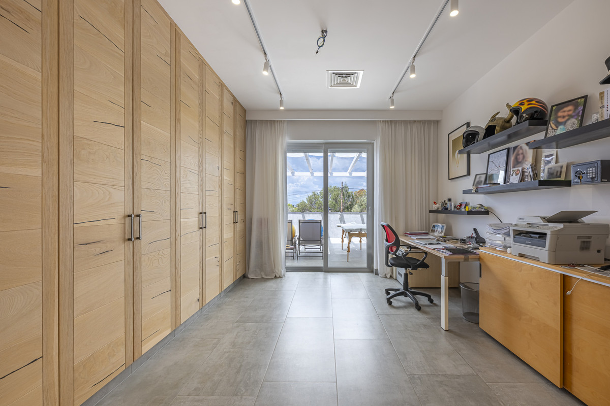 Inside, the villa feels bright, open and welcoming. The heart of the home is the spacious living room, designed with floor-to-ceiling glass doors that open directly onto the terrace, framing fantastic views of the sea and surrounding greenery. Natural light floods in from all angles, creating a warm and inviting atmosphere. The contemporary kitchen with breakfast area flows naturally into this space, making it ideal for family life and entertaining. There are four deluxe bedrooms, including a main suite with indoor and outdoor showers.