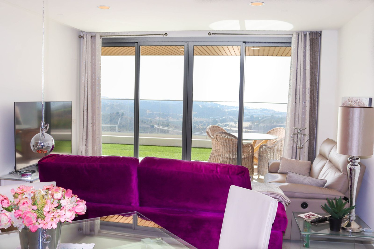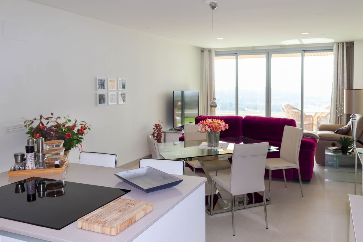 The open-plan kitchen – with sea views – flows seamlessly into the living area and lounge, creating an ideal environment for entertaining and interacting. Equipped with state-of-the-art appliances and a smart layout, this kitchen is a space where functionality meets modern design. From here, you can access the extra-large terrace, which offers panoramic views of the sea, golf, and mountains and is perfect for al fresco dining, relaxing in the sun, or enjoying the scenery. The covered section of the terrace has been enclosed with Lumon glass curtains, making it a versatile space to be enjoyed comfortably throughout the year, while still preserving the open views and natural light.