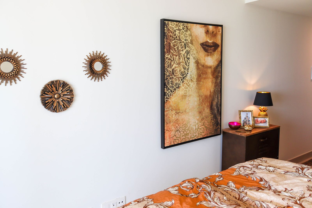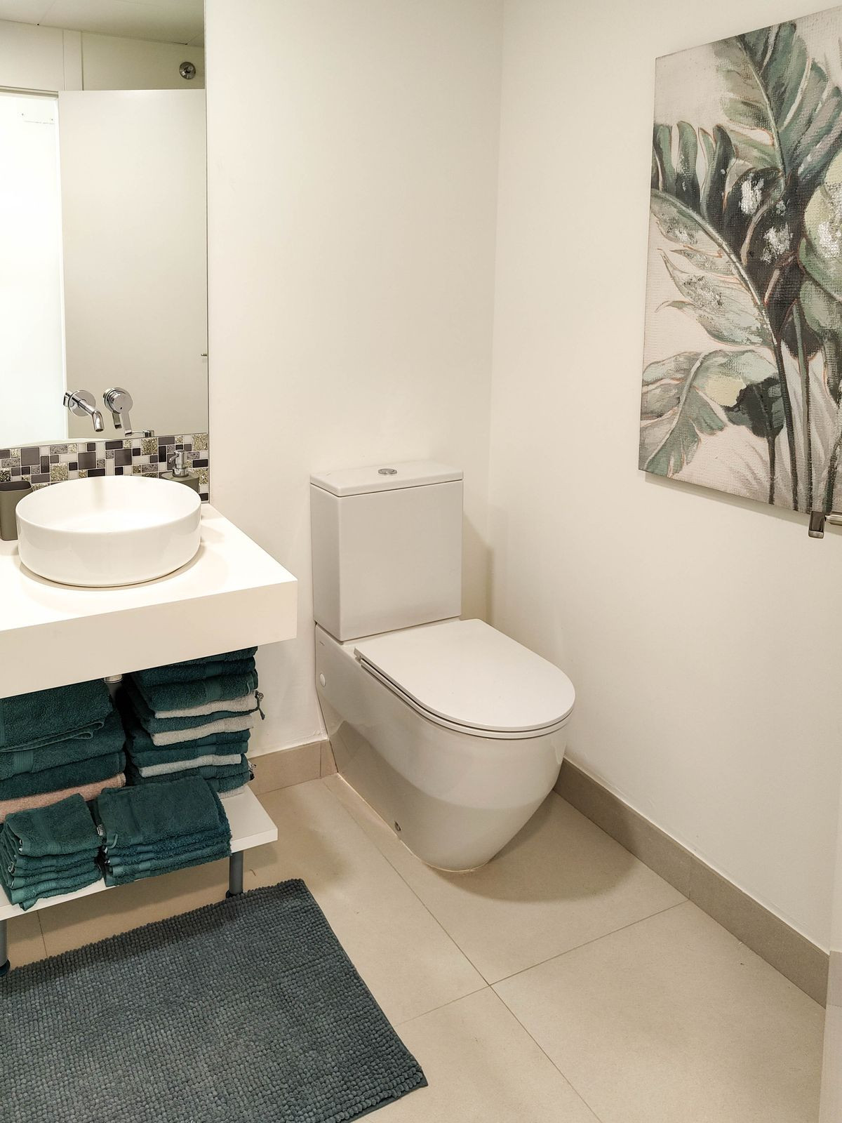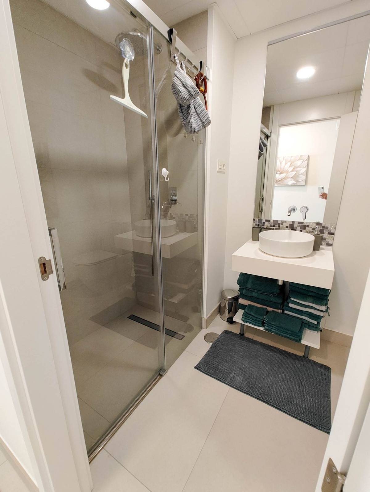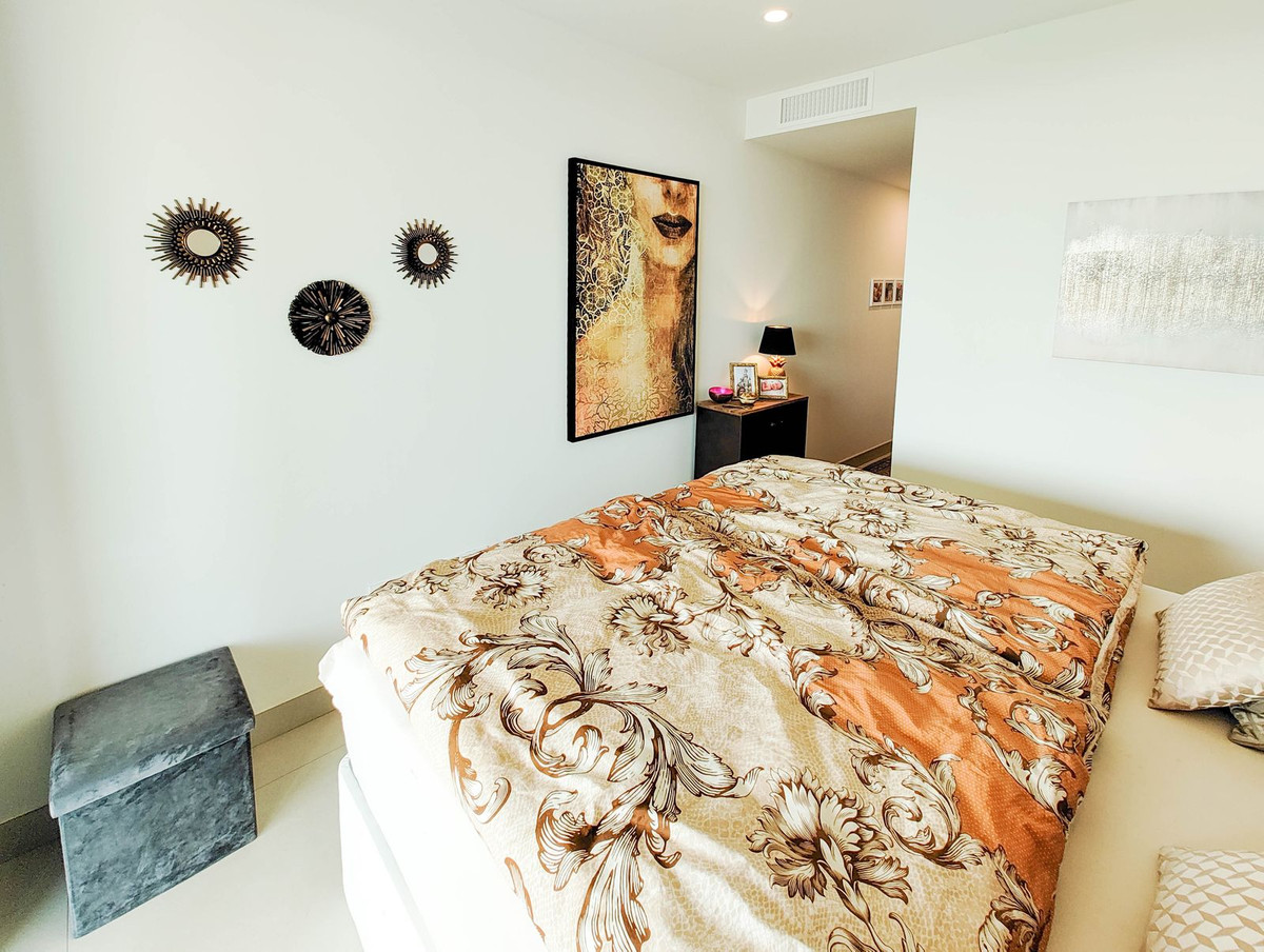 The two spacious en-suite bedrooms offer a tranquil and relaxing space and are designed with great attention to detail, for example the walk-in closet in the master bedroom. The large windows let in plenty of natural light and offer panoramic views of the surroundings as well as direct access to the terrace.