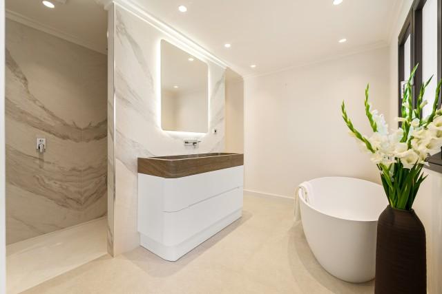 Découvrez un intérieur lumineux aux tons neutres, aux élégantes finitions en bois et à l'éclairage LED d'ambiance qui crée une atmosphère contemporaine et chaleureuse. Le rez-de-chaussée relie harmonieusement un salon et une salle à manger lumineux à un patio privé par de larges portes coulissantes, complété par un bureau paisible donnant sur le jardin. Une cuisine moderne laquée blanche, équipée d'électroménagers Siemens, s'ouvre sur un charmant patio, idéal pour des réunions plus intimes.