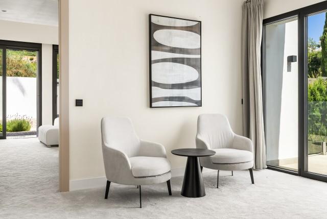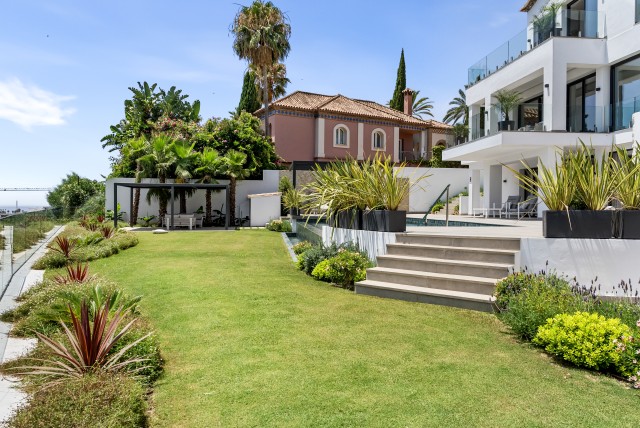 À l'extérieur, de magnifiques jardins paysagers entourent une piscine d'eau salée chauffée, avec de vastes terrasses conçues pour les repas en plein air et la détente au soleil. La propriété comprend également un garage pour trois voitures ainsi qu'une allée de stationnement supplémentaire, le tout dans la sécurité et la sérénité de l'une des résidences les plus prisées de la Costa del Sol.