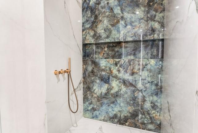 Le sous-sol complète l'offre de vie avec un deuxième salon avec kitchenette, une salle de cinéma privée, une salle de sport ultramoderne avec hammam et douche, ainsi qu'une buanderie. Les salles de bains offrent des finitions haut de gamme, avec des robinetteries Gessi raffinées et du carrelage en porcelaine italienne grand format.