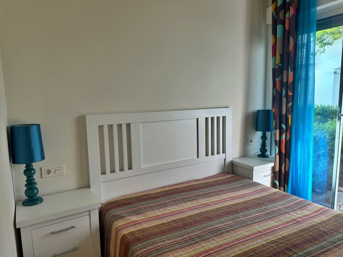 The apartment is distributed over two levels, featuring a bright and open layout that provides direct access to a private terrace and garden area—perfect for relaxing outdoors, sunbathing, or entertaining guests. The interior includes a generously sized living and dining area with large windows that offer views of the beautifully maintained communal swimming pool, a fully equipped modern kitchen, and two spacious bedrooms, including a master suite with its own en-suite bathroom. The property also includes a second full bathroom and a guest toilet for added convenience.