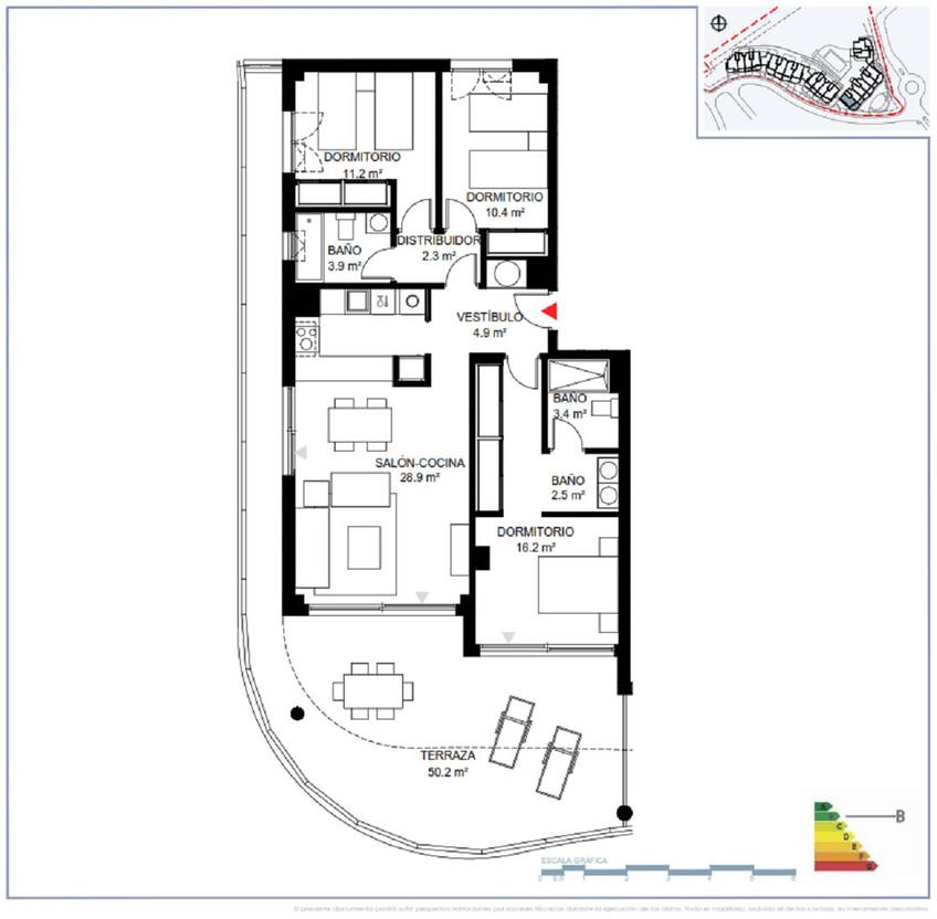 Hall, spacious lounge with open plan kitchen and access to the terrace, master bedroom with en suite bathroom and access to the terrace before mentioned. Back to the hall, 2nd bedroom, bathroom and 3rd bedroom.